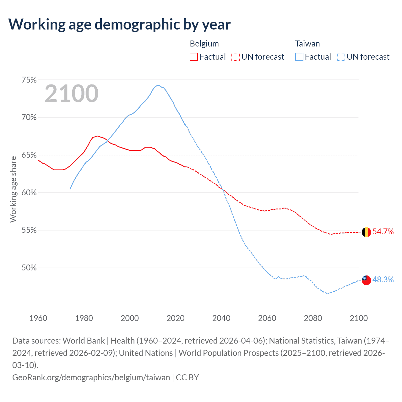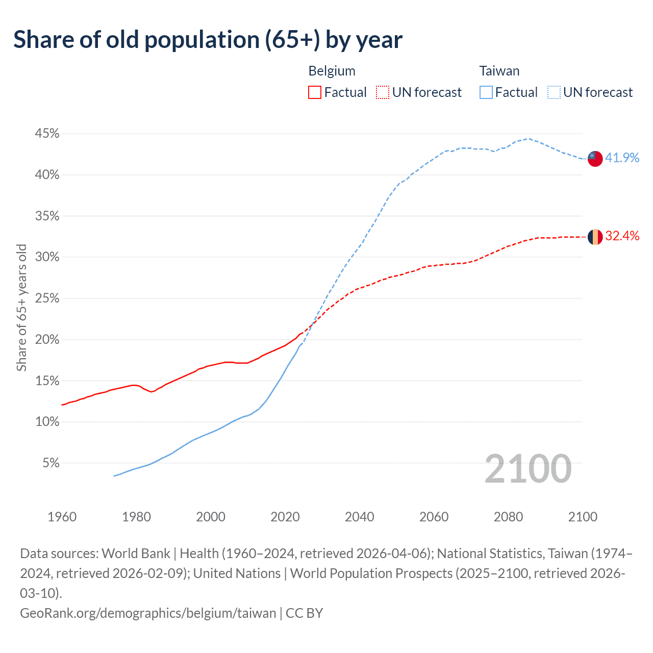 Median age Belgium vs Taiwan, 1960-2100