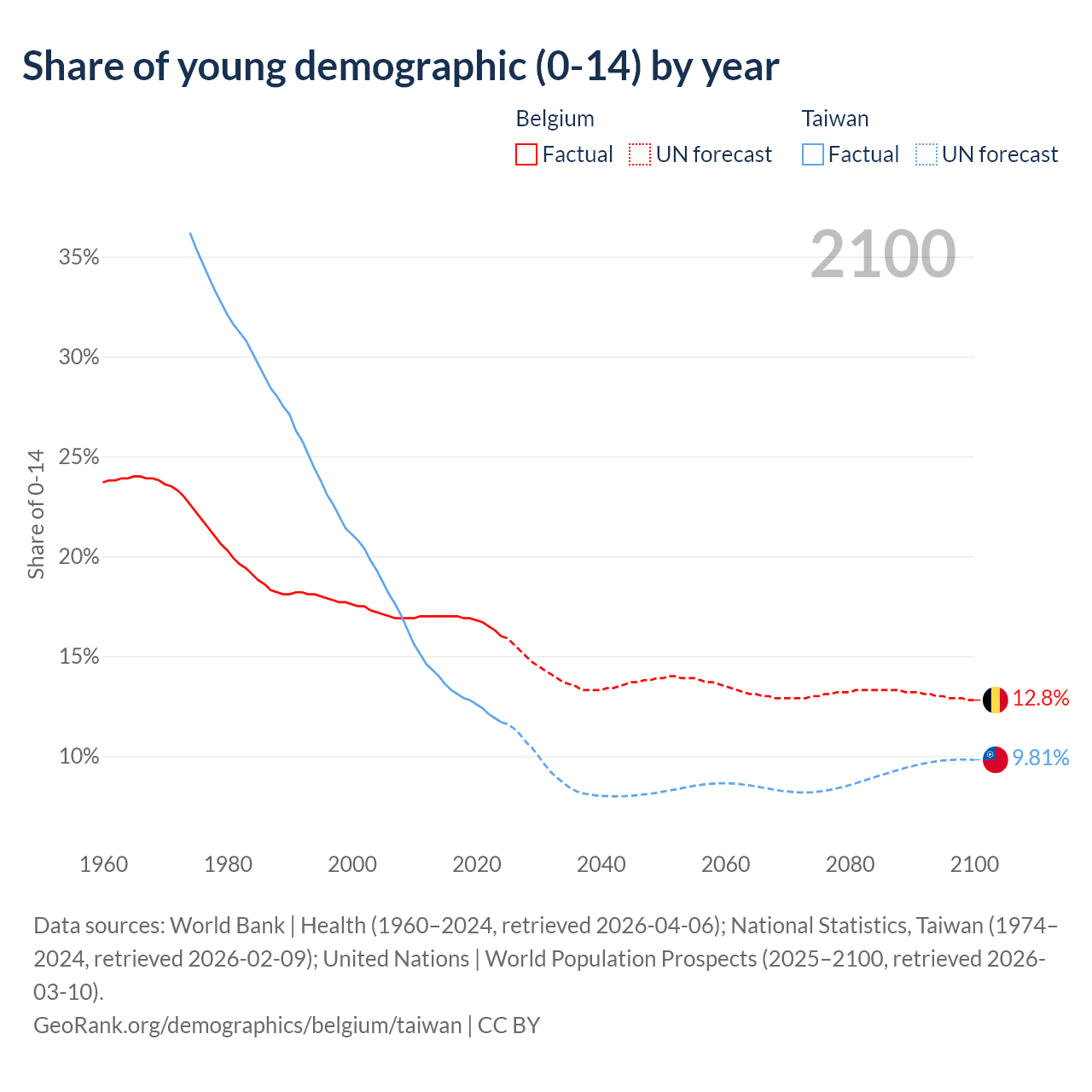 - The share of young demographic (0-15 years old) in Belgium is 16% vs 11.7% in Taiwan.