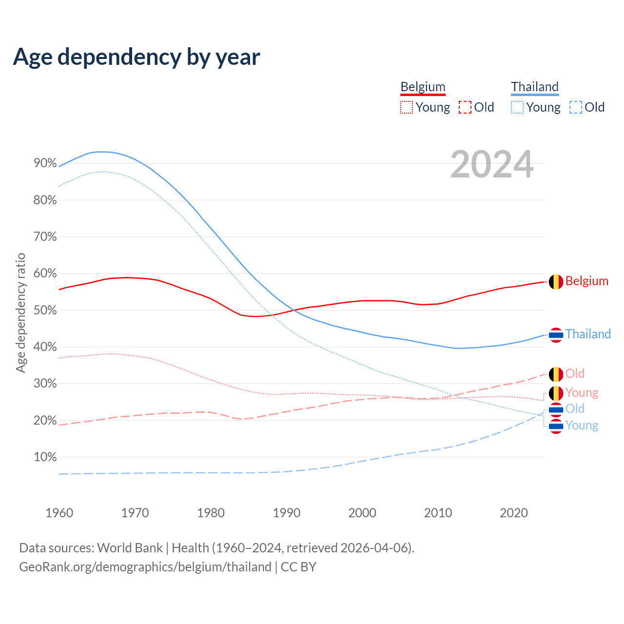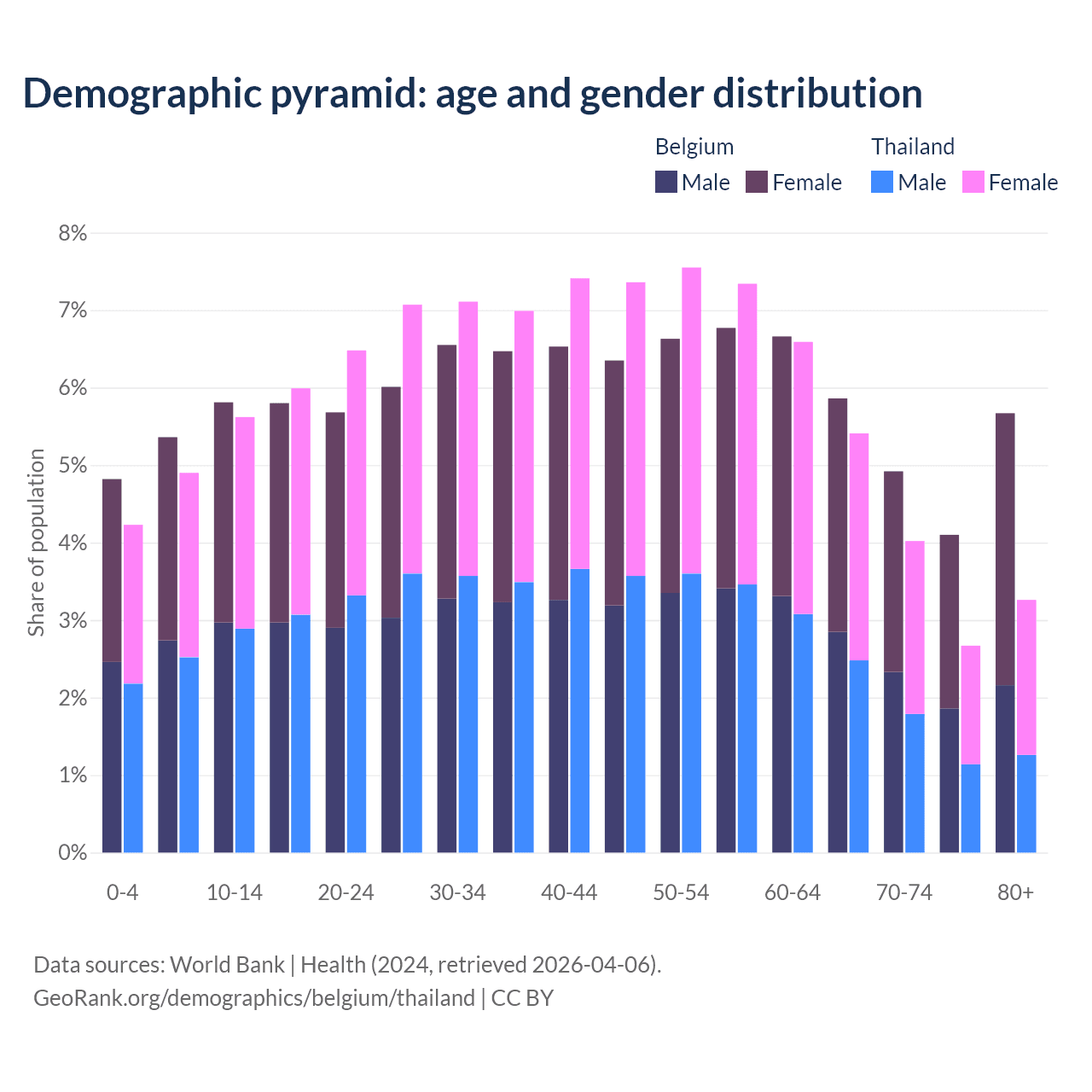 - Belgium is ranked 32/196 by median age (oldest to youngest) vs 40/196 for Thailand.