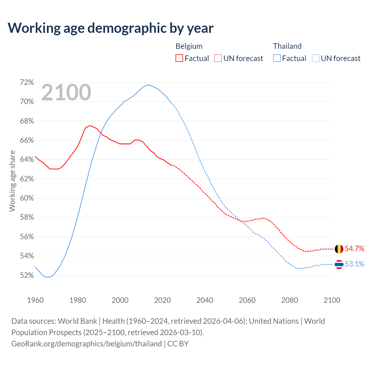 - Belgium has 7.55M working age adults (aged 15-64) vs 50M in Thailand.