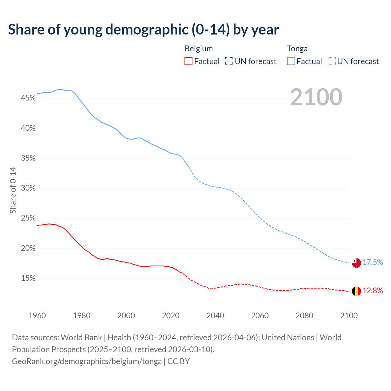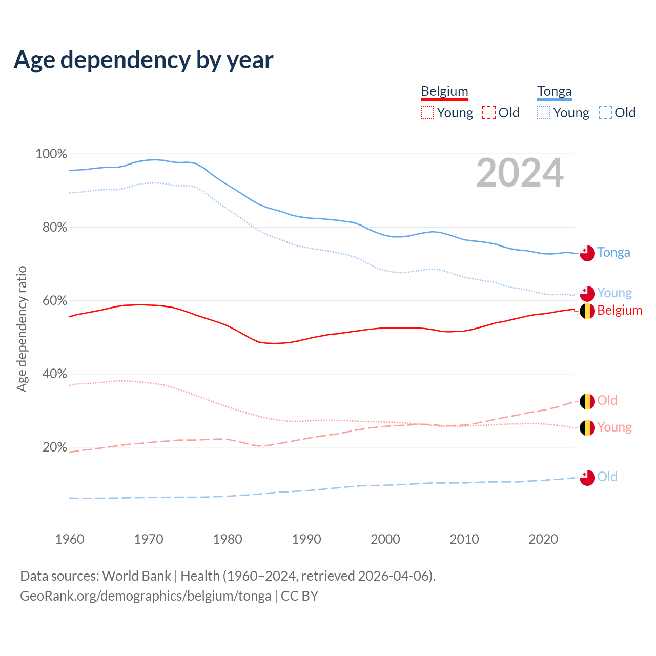 - The share of young demographic (0-15 years old) in Belgium is 16% vs 35.4% in Tonga.