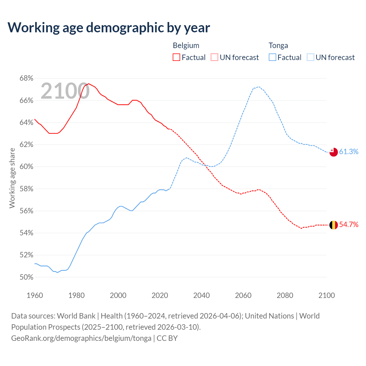 - Belgium has 7.55M working age adults (aged 15-64) vs 59.8K in Tonga.