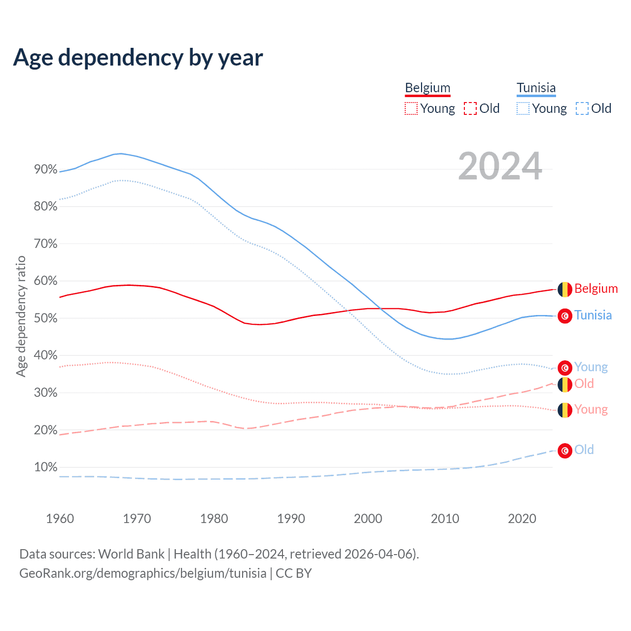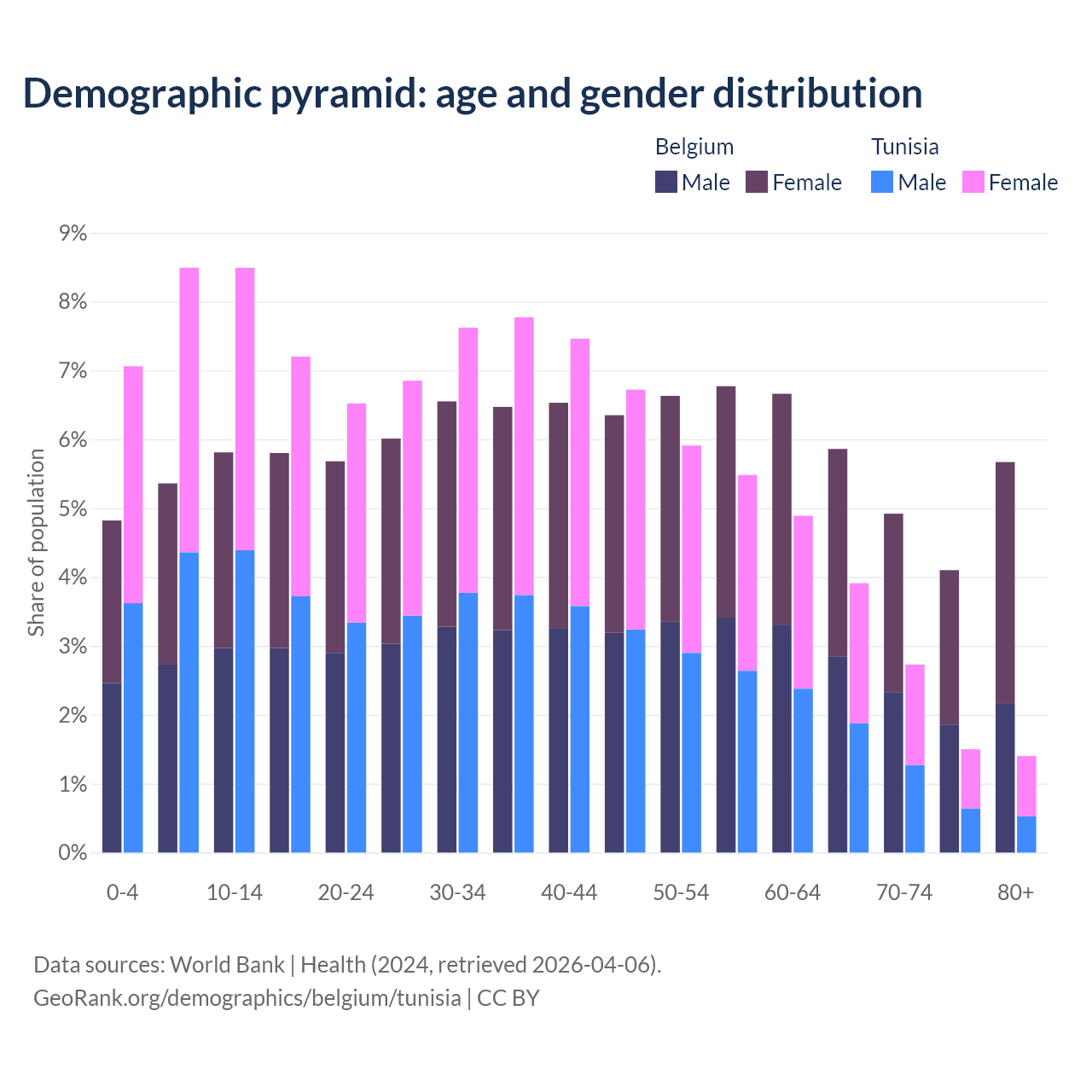 - Belgium is ranked 32/196 by median age (oldest to youngest) vs 86/196 for Tunisia.
