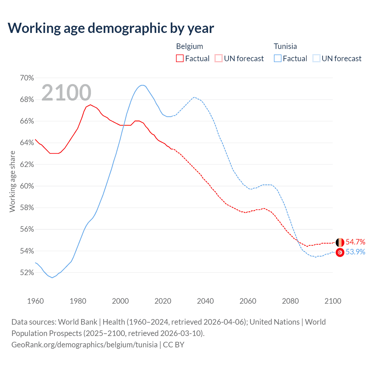 - Belgium has 7.55M working age adults (aged 15-64) vs 8.26M in Tunisia.