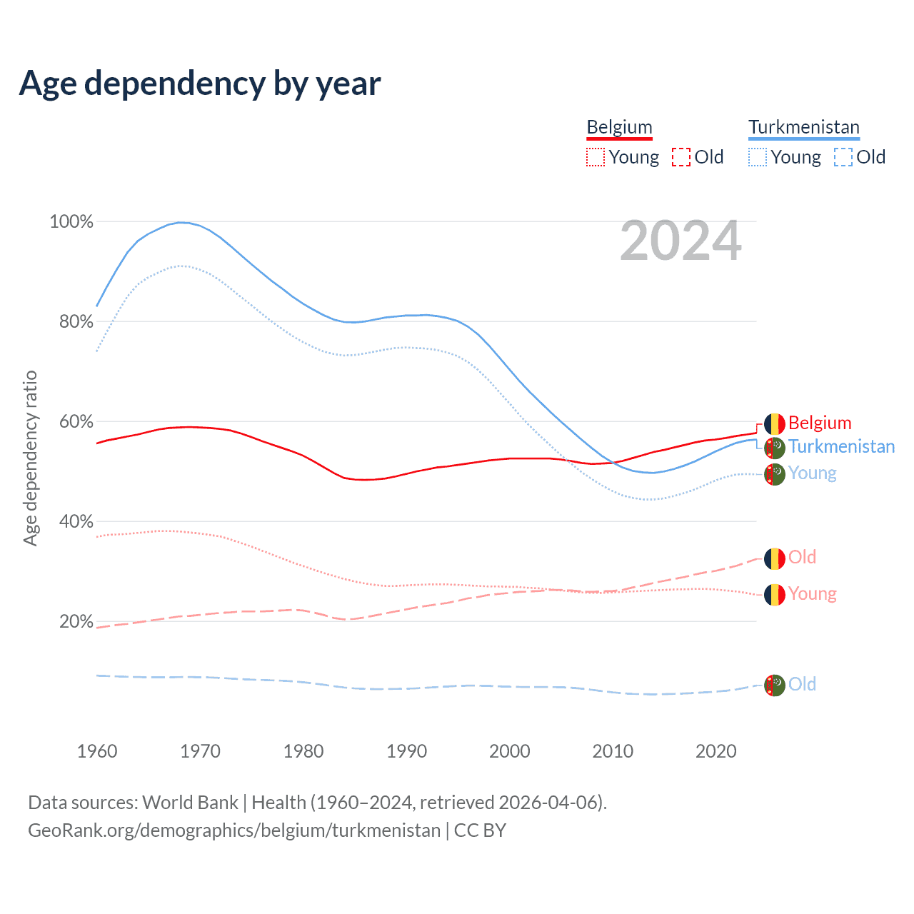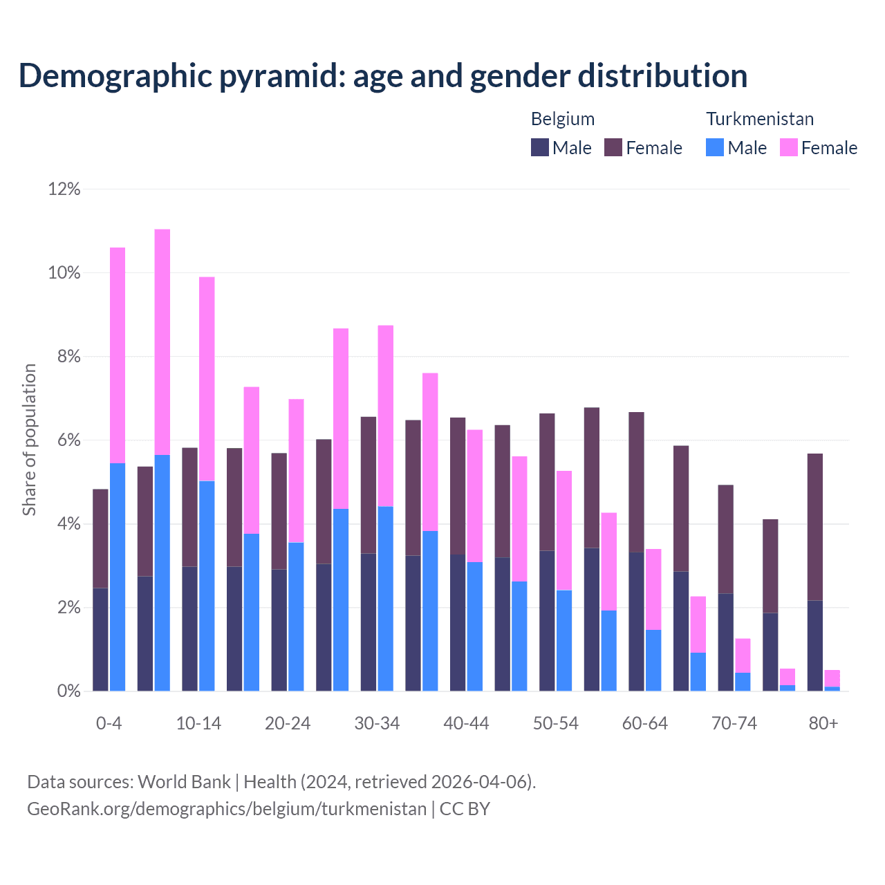- The share of old-age demographic (65+) in Belgium is 20.6% vs 4.53% in Turkmenistan.