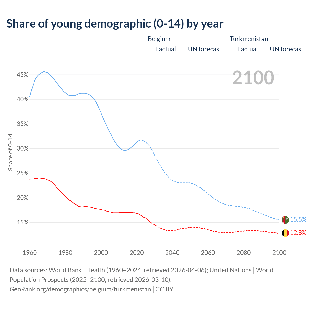 - The share of young demographic (0-15 years old) in Belgium is 16% vs 31.5% in Turkmenistan.
