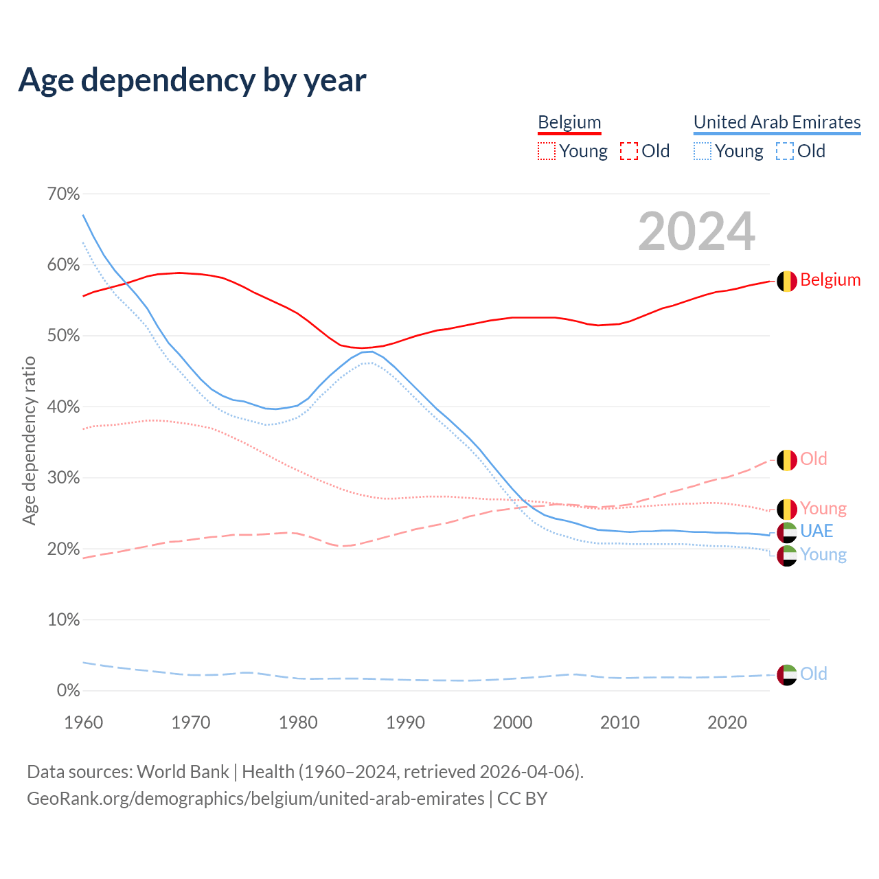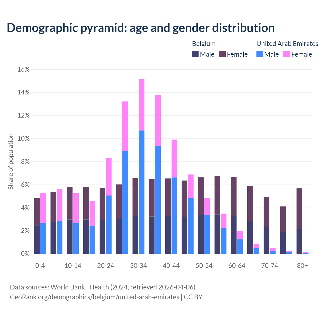 - Belgium is ranked 32/196 by median age (oldest to youngest) vs 91/196 for the United Arab Emirates.