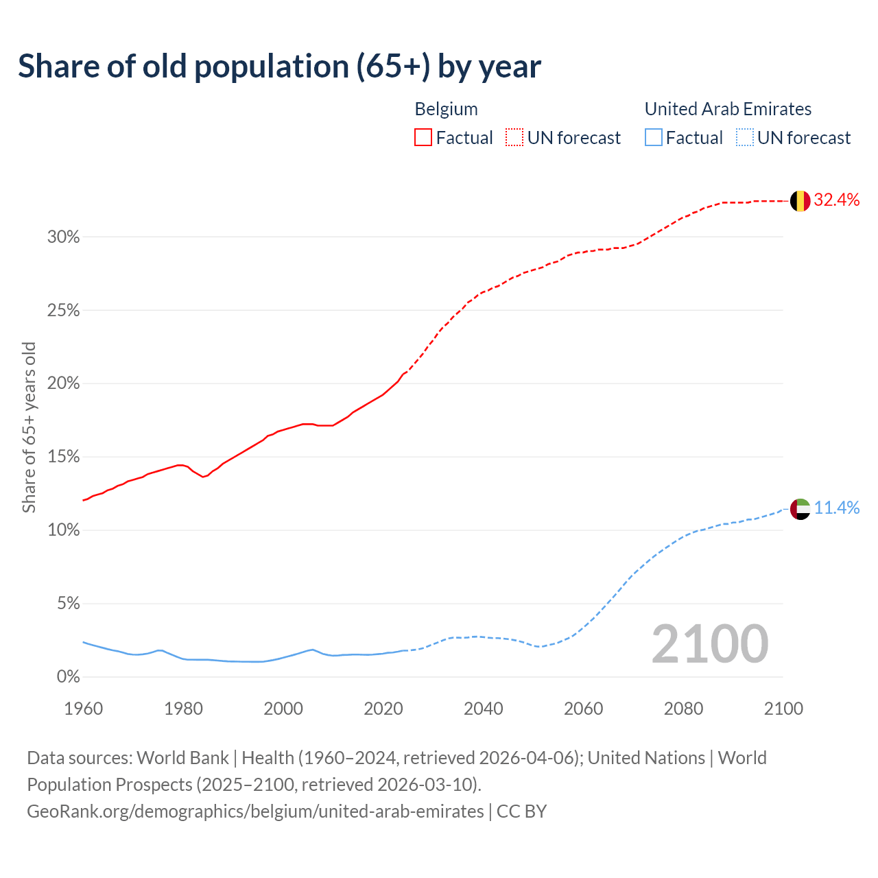 - The share of old-age demographic (65+) in Belgium is 20.6% vs 1.77% in the United Arab Emirates.