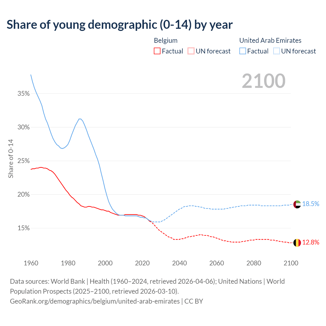 - The share of young demographic (0-15 years old) in Belgium is 16% vs 16.1% in the United Arab Emirates.