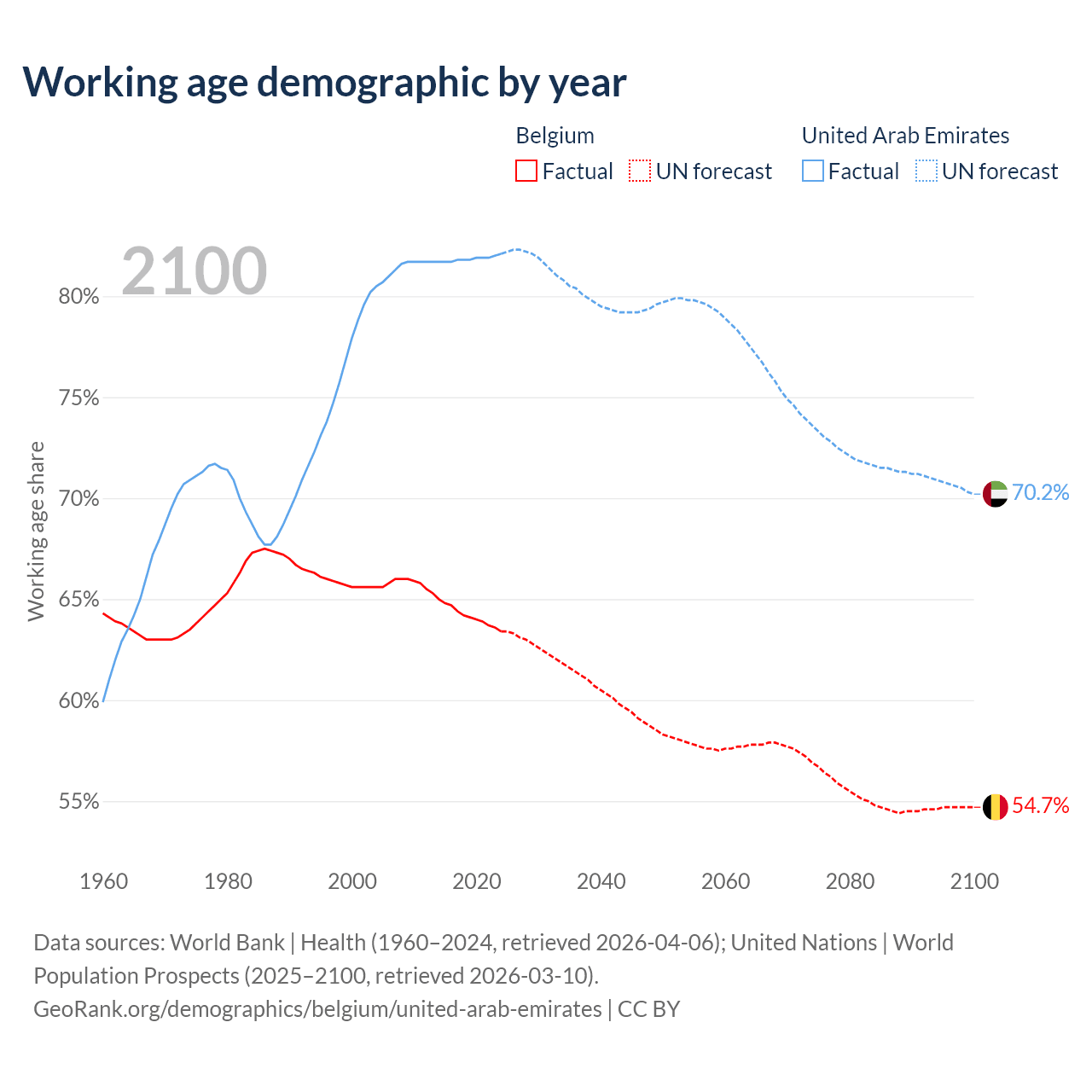 - Belgium has 7.55M working age adults (aged 15-64) vs 9.6M in the United Arab Emirates.