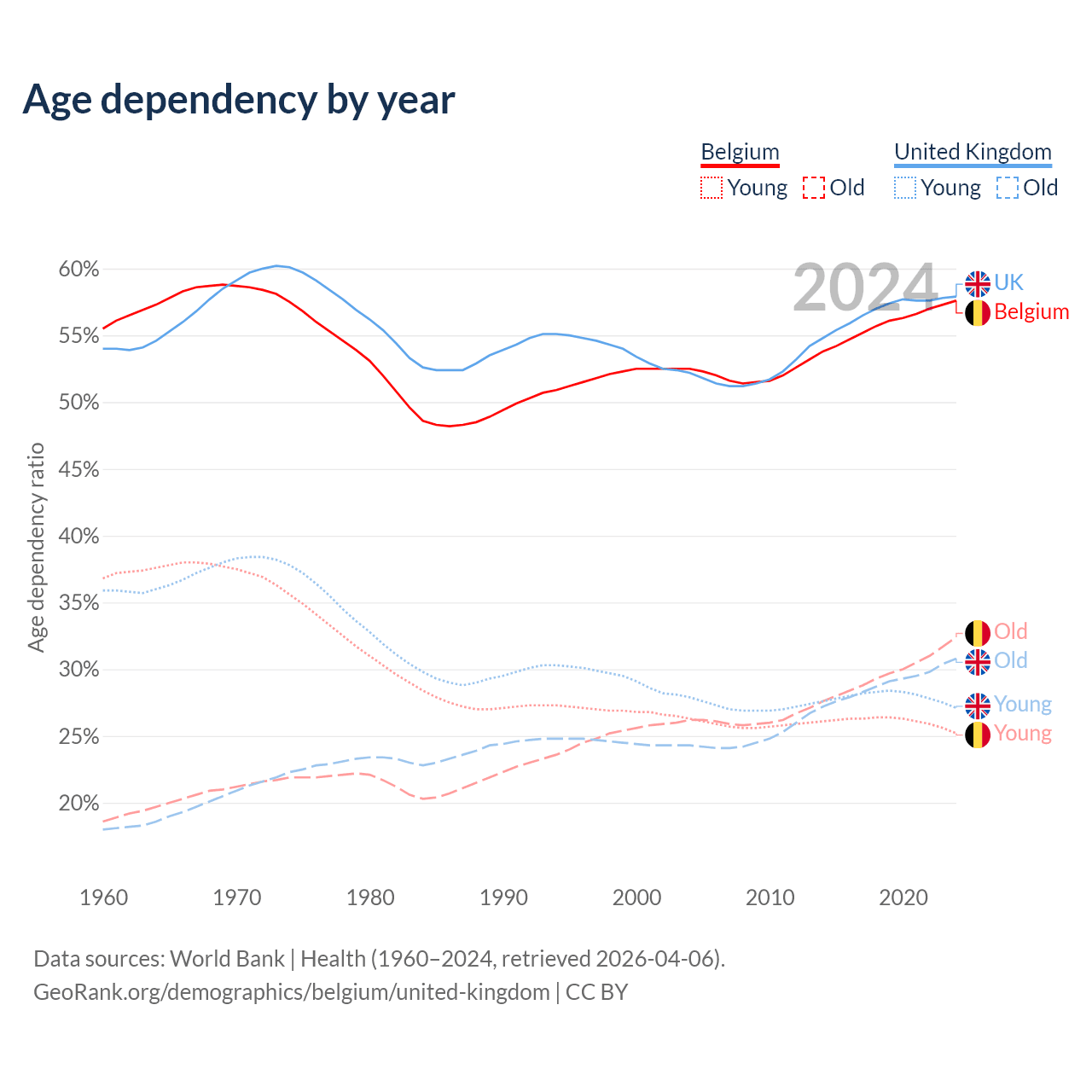 - The share of young demographic (0-15 years old) in Belgium is 16% vs 17.2% in the United Kingdom.