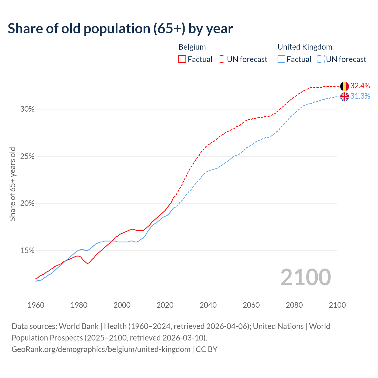 Median age Belgium vs United Kingdom, 1960-2100