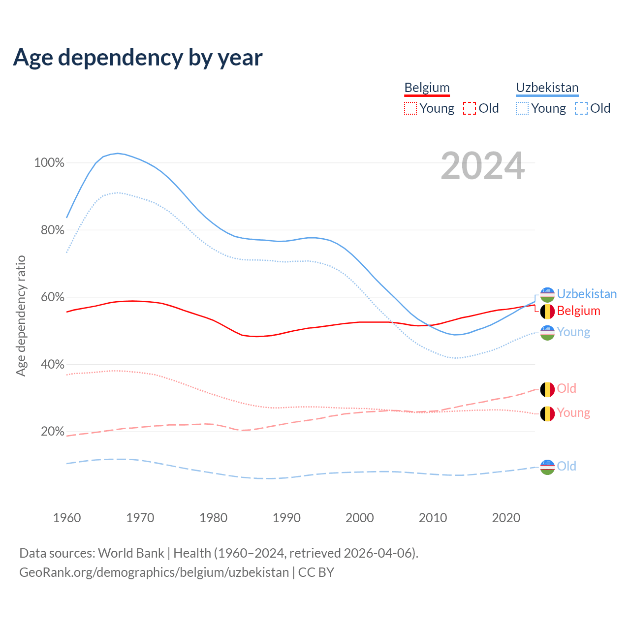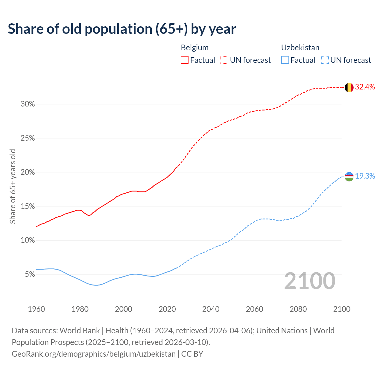 - The share of old-age demographic (65+) in Belgium is 20.6% vs 5.86% in Uzbekistan.