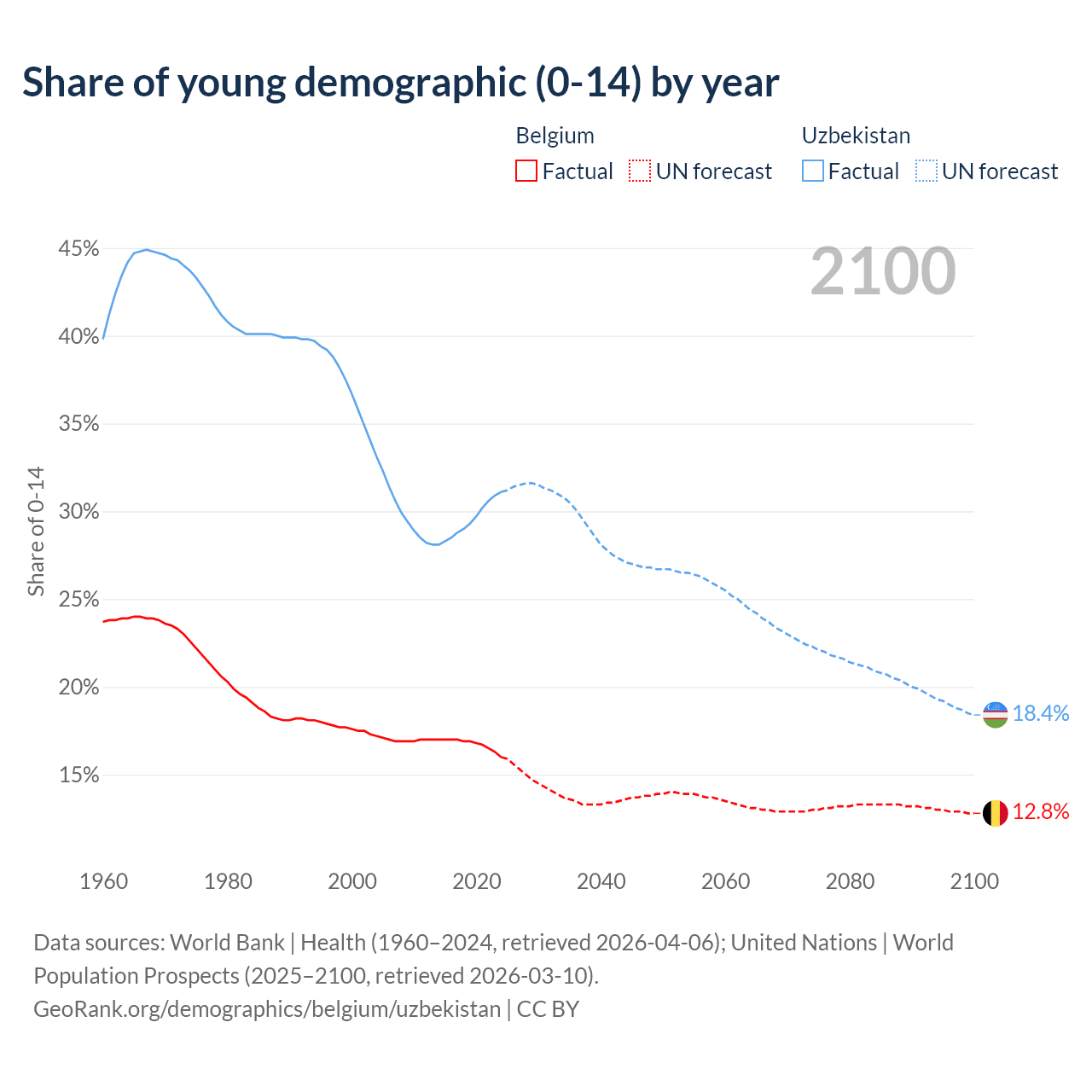 - The share of young demographic (0-15 years old) in Belgium is 16% vs 31.1% in Uzbekistan.