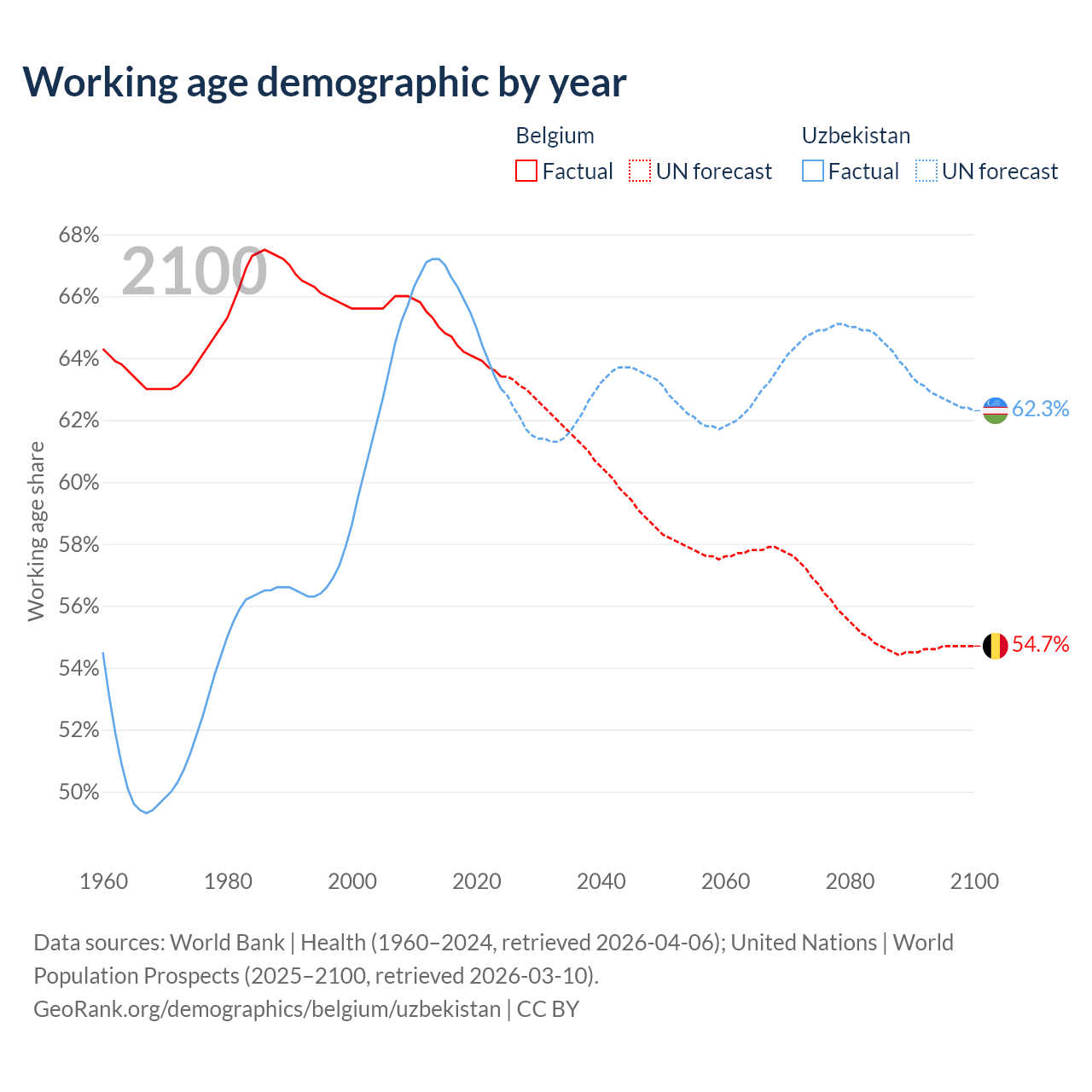 Median age Belgium vs Uzbekistan, 1960-2100