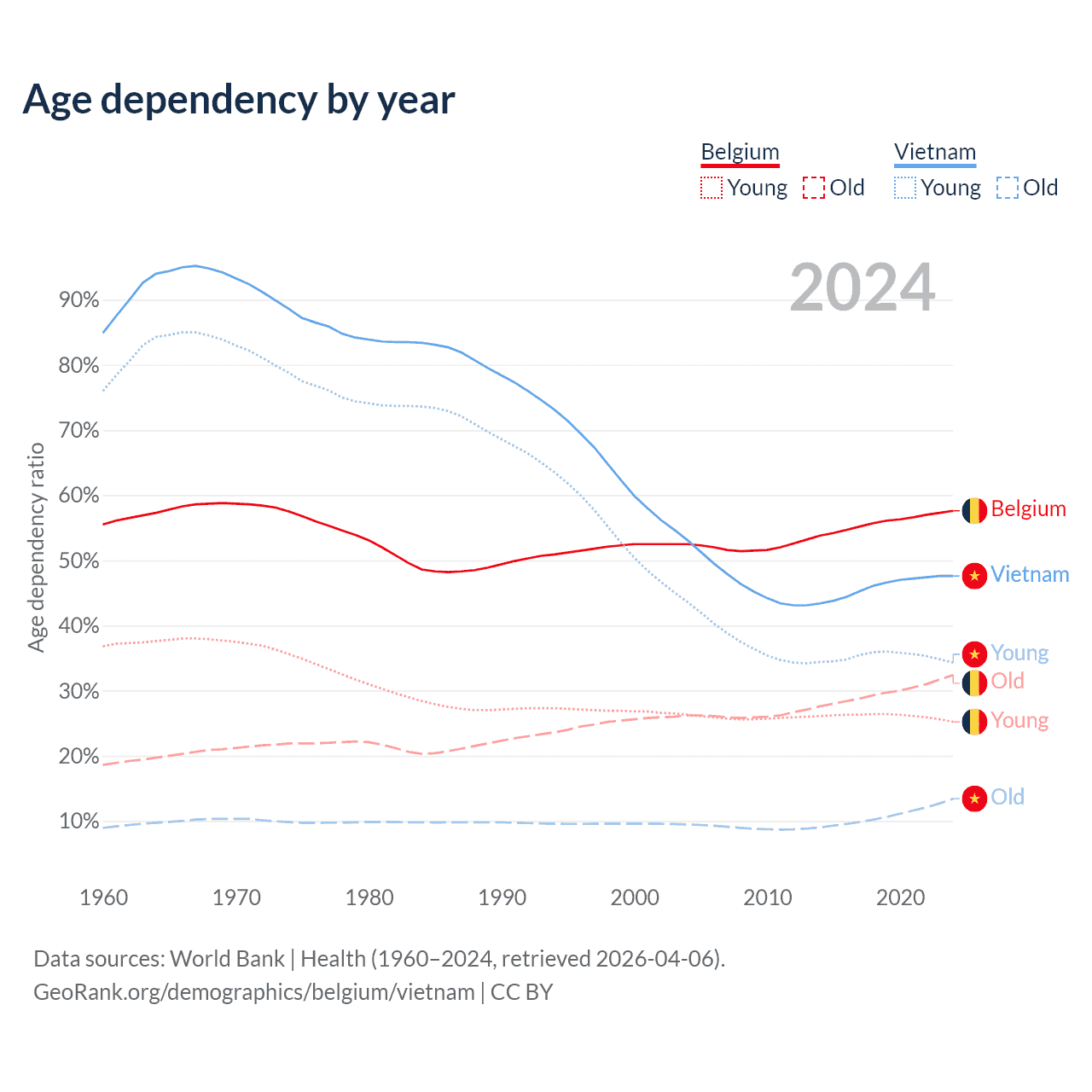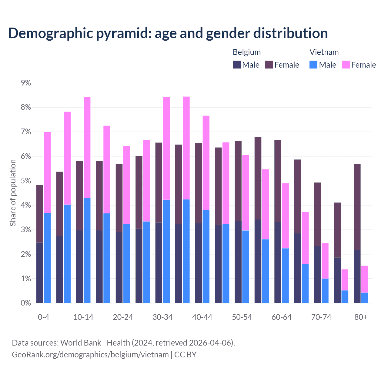 - The share of old-age demographic (65+) in Belgium is 20.6% vs 9.05% in Vietnam.