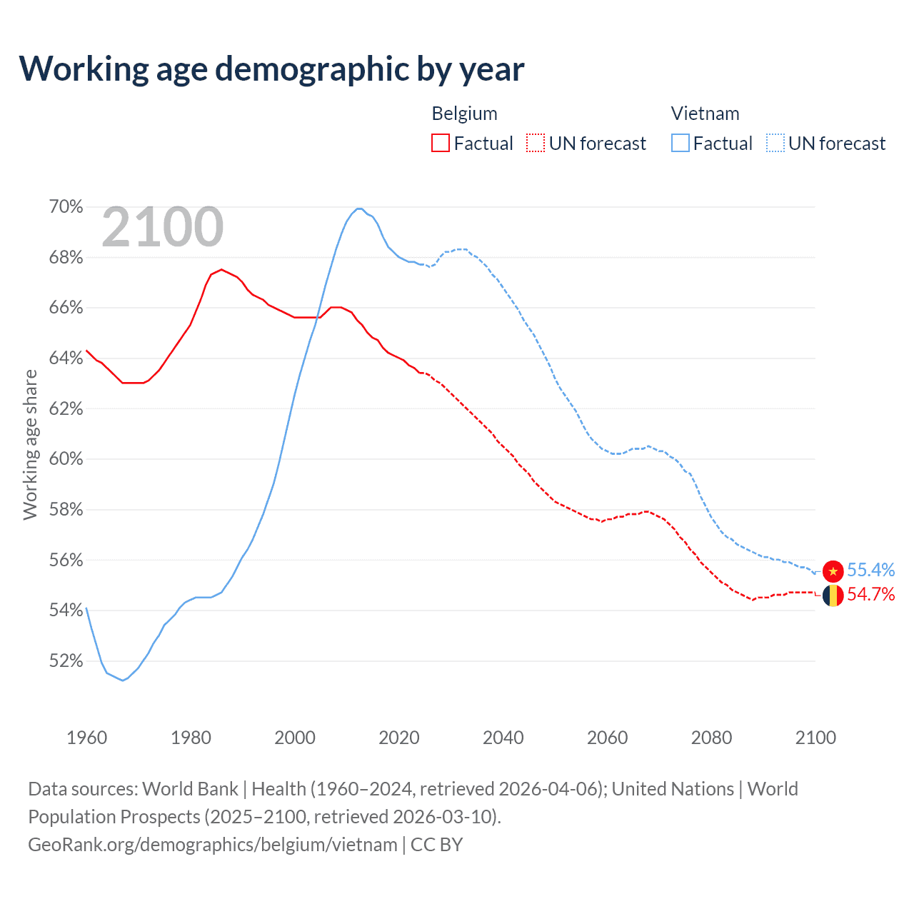 Median age Belgium vs Vietnam, 1960-2100
