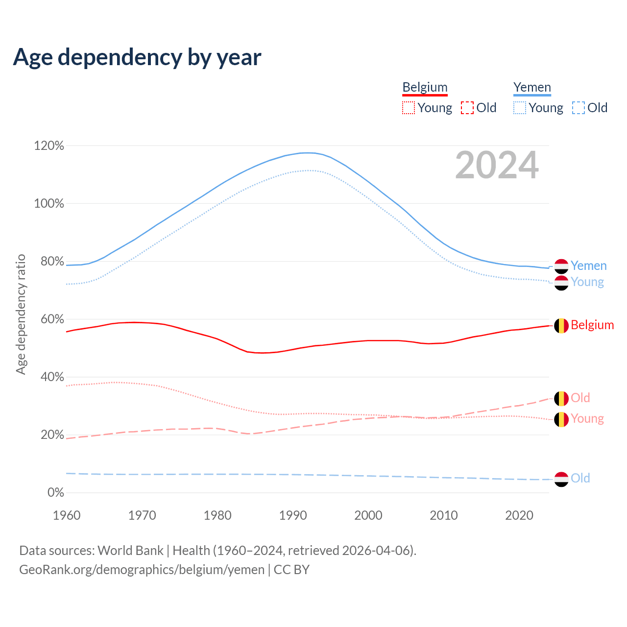 The share of older people aged 65 and over is 20.6% in Belgium and 2.52% in Yemen. Life expectancy in Belgium compared to Yemen .