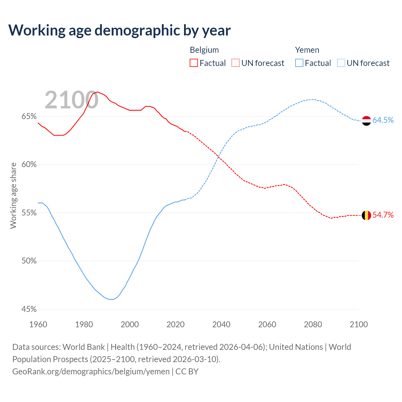 - Belgium has 7.55M working age adults (aged 15-64) vs 24.4M in Yemen.