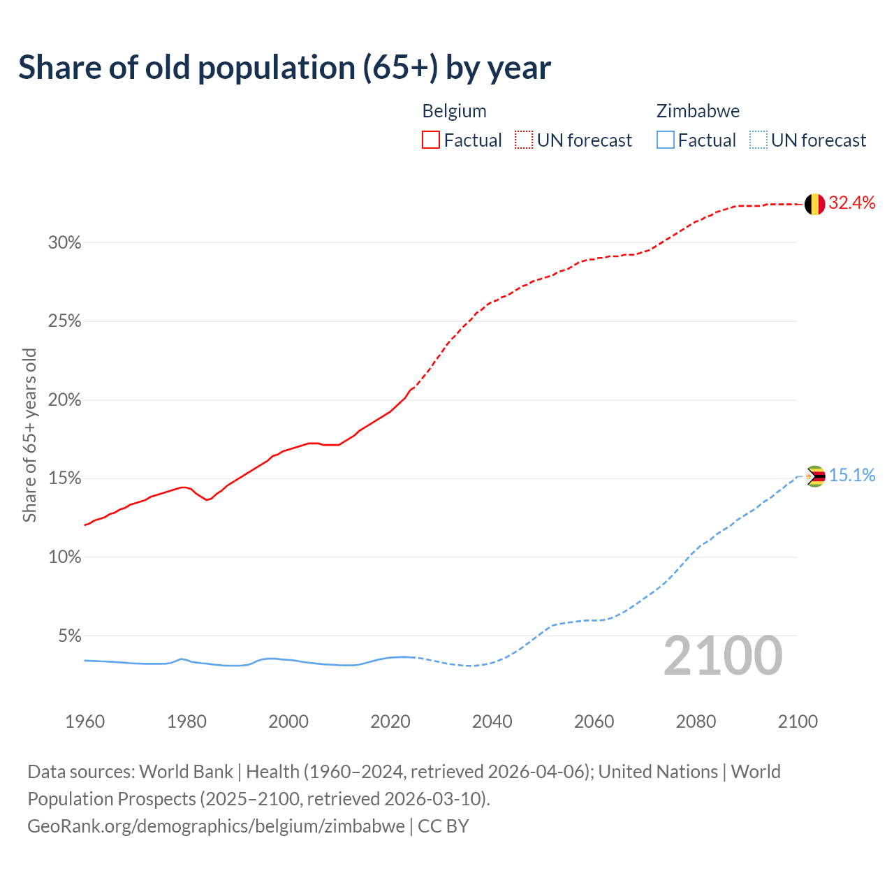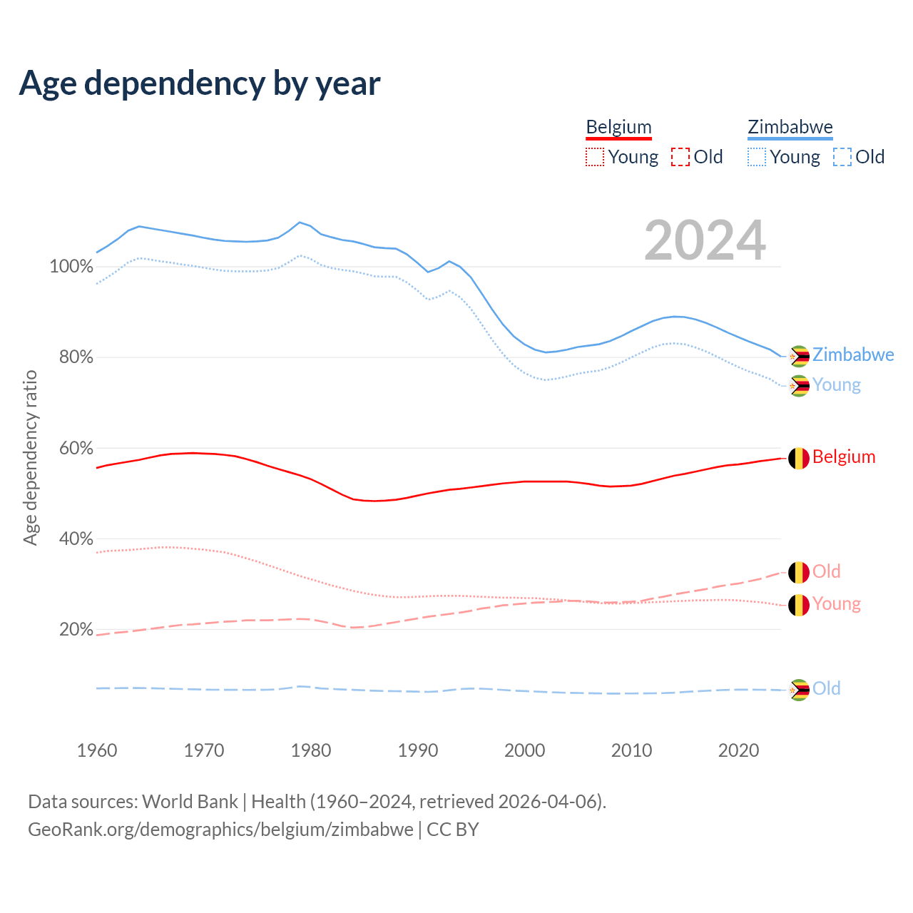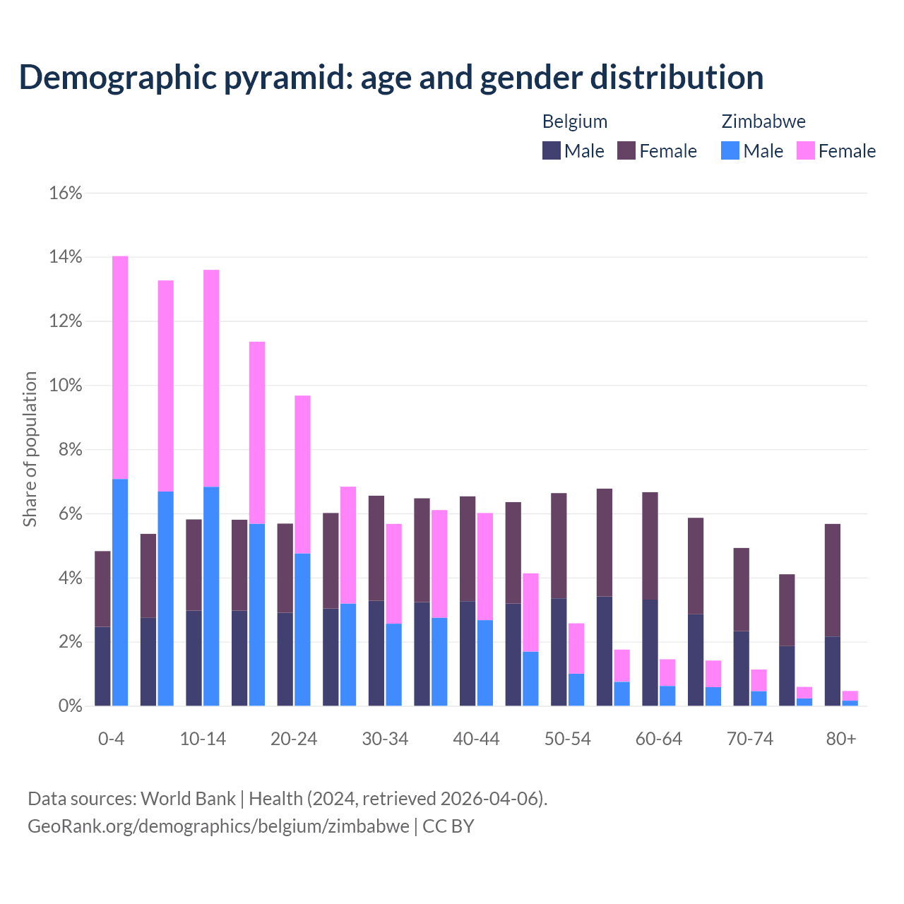 - The share of old-age demographic (65+) in Belgium is 20.6% vs 3.6% in Zimbabwe.