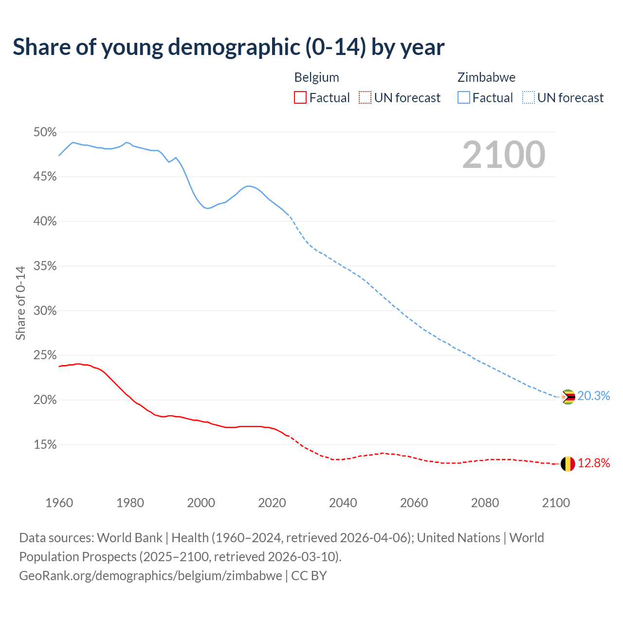 - The share of young demographic (0-15 years old) in Belgium is 16% vs 40.9% in Zimbabwe.