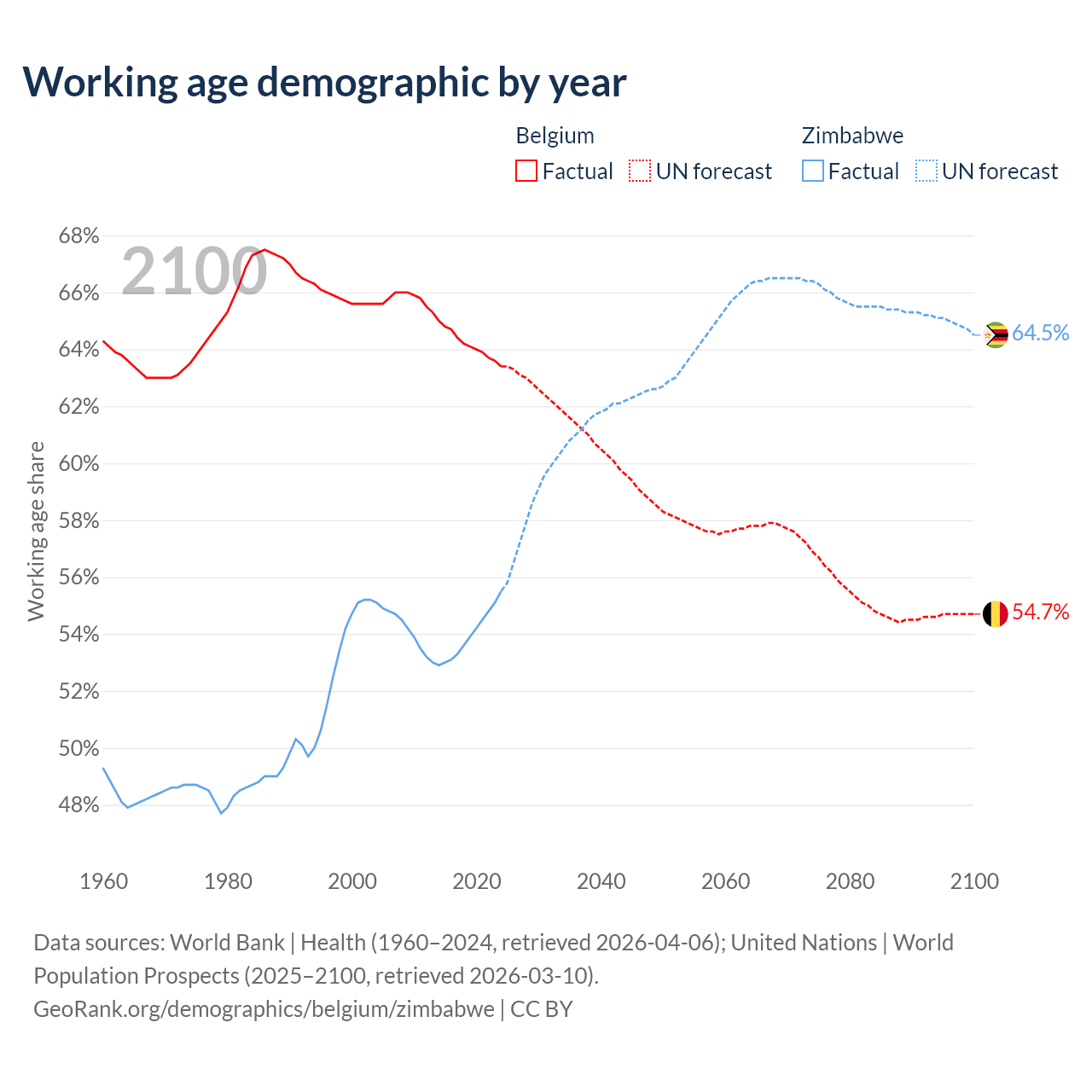 Median age Belgium vs Zimbabwe, 1960-2100