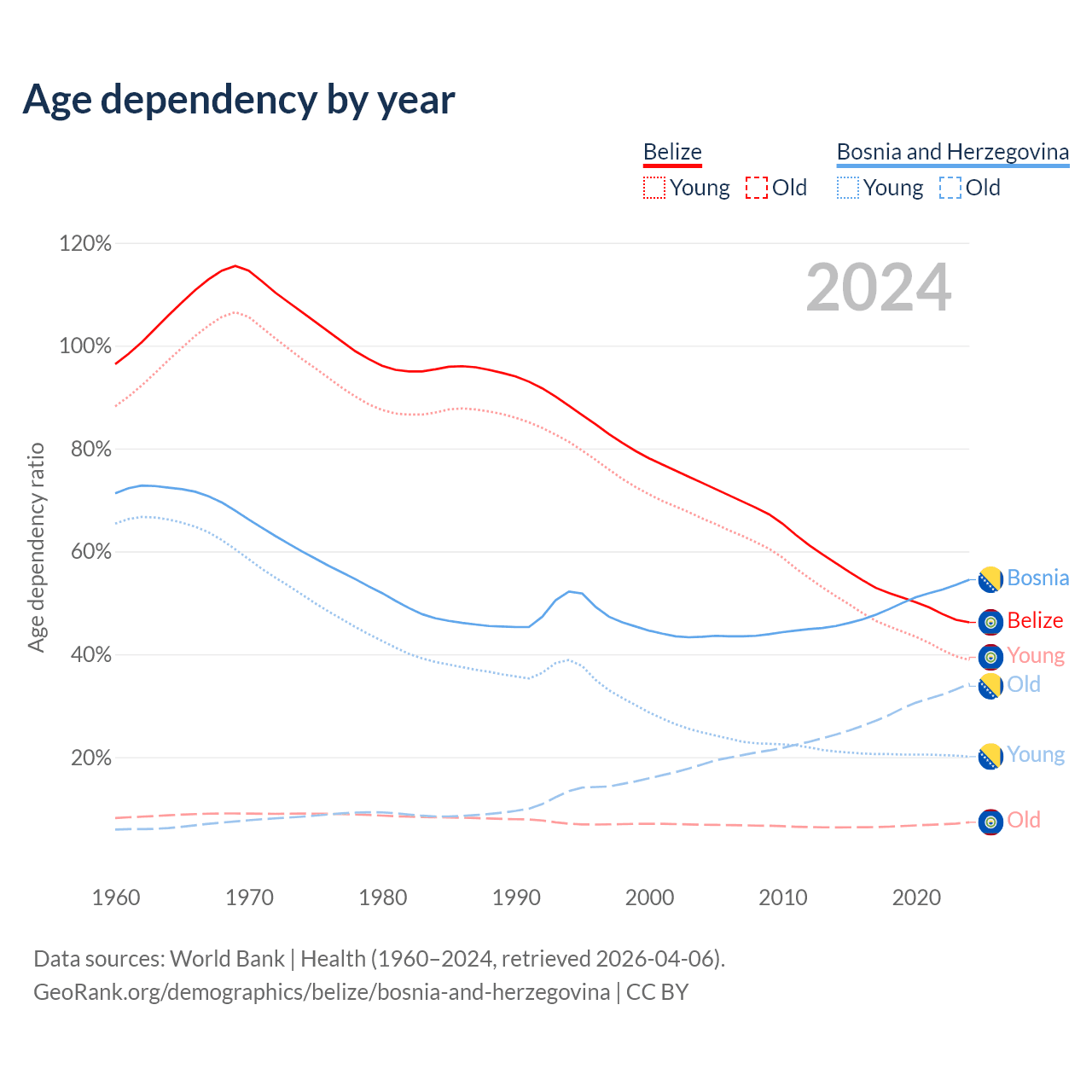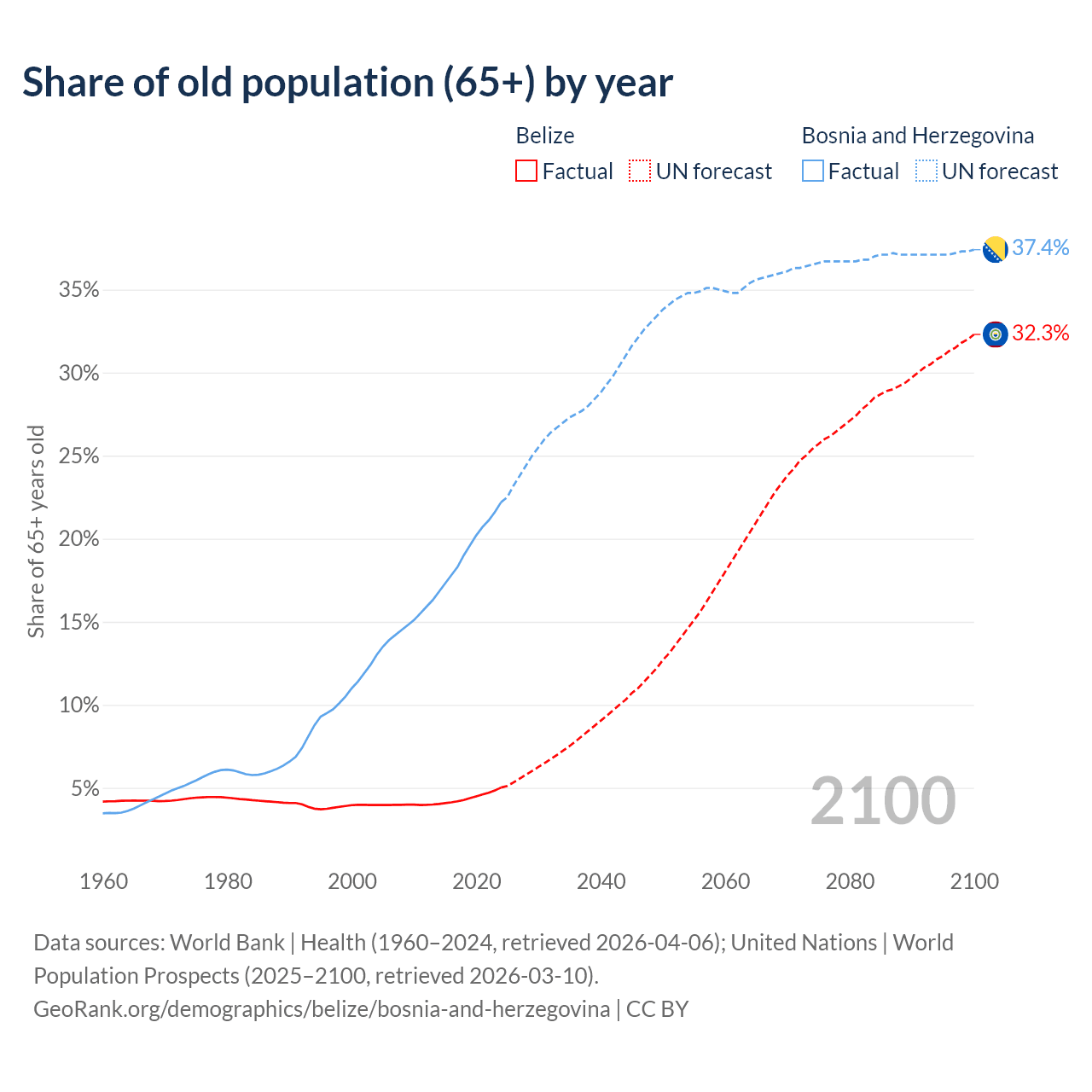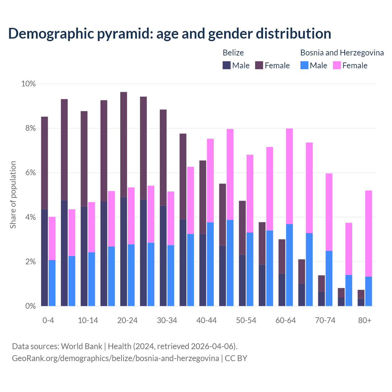 - The share of old-age demographic (65+) in Belize is 5.02% vs 22.2% in Bosnia and Herzegovina.