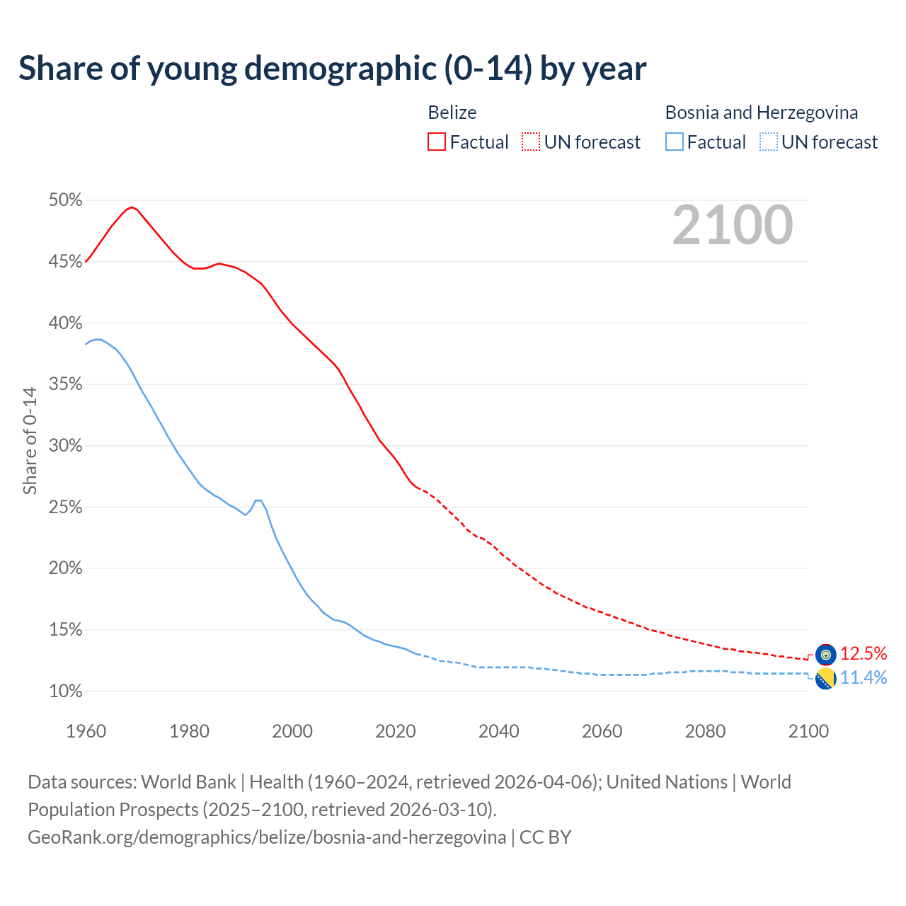 - The share of young demographic (0-15 years old) in Belize is 26.6% vs 13% in Bosnia and Herzegovina.