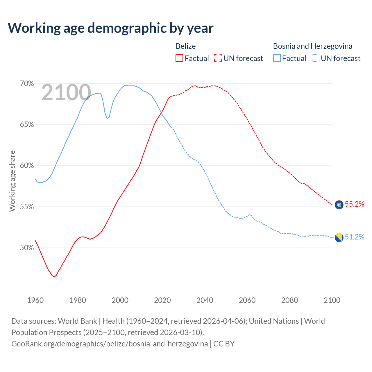 Median age Belize vs Bosnia and Herzegovina, 1960-2100