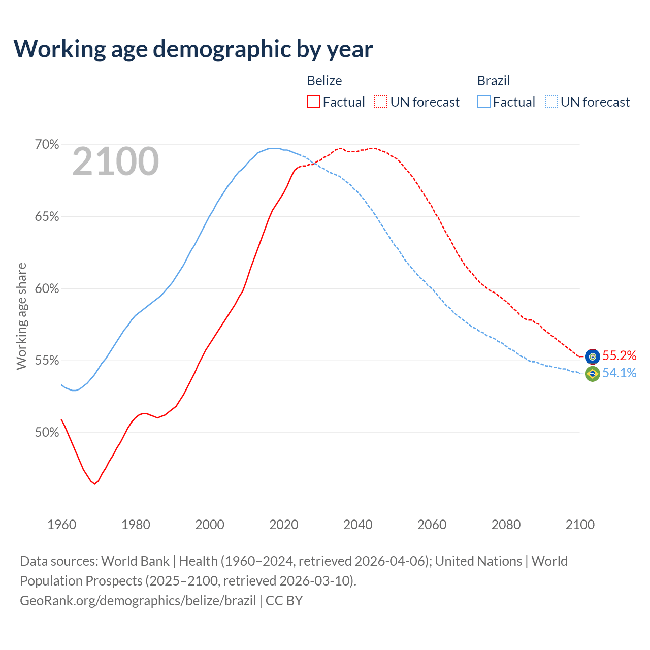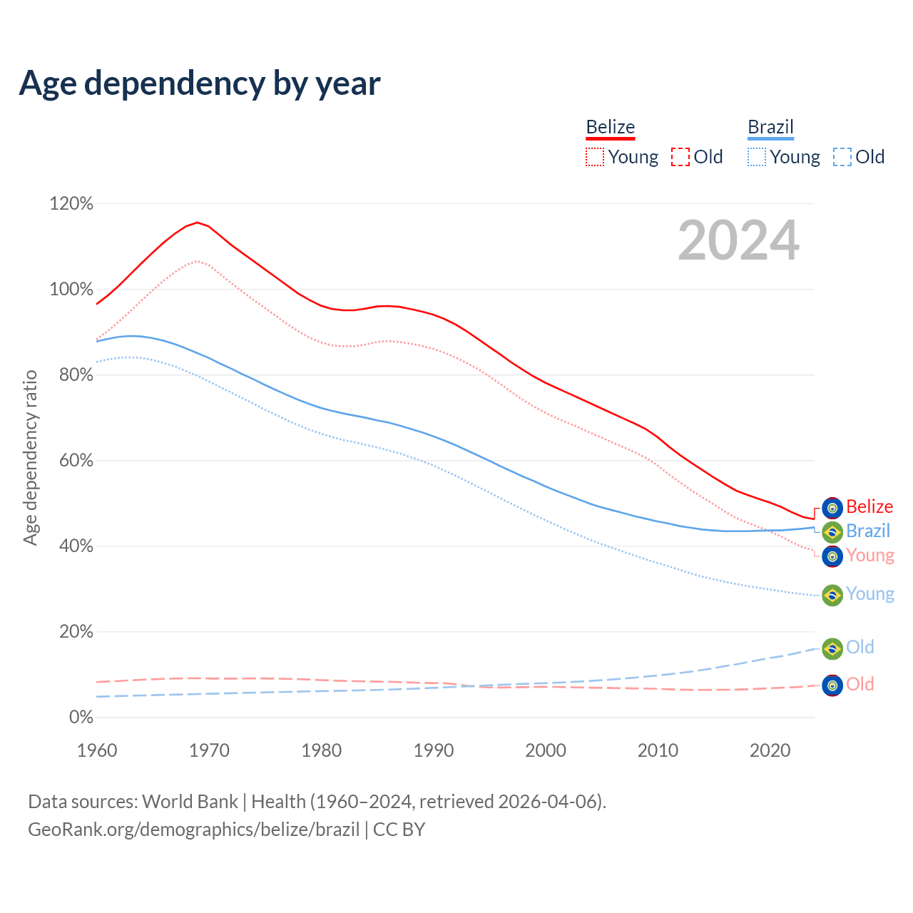 - Belize is ranked 120/196 by median age (oldest to youngest) vs 73/196 for Brazil.