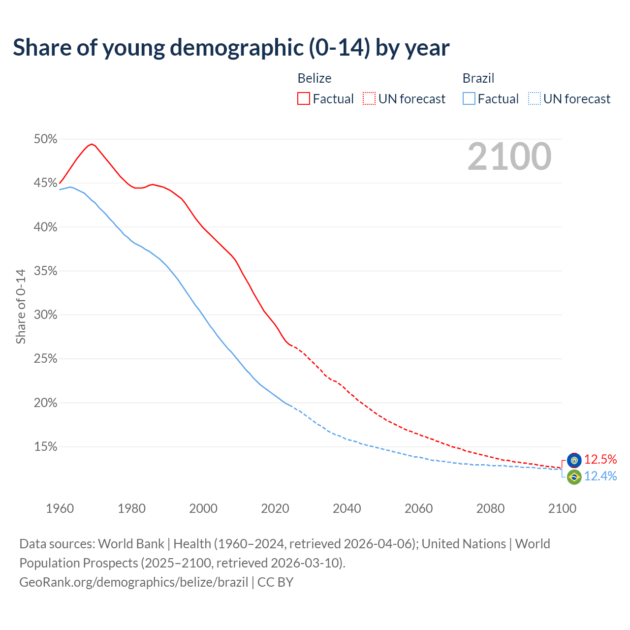- The share of young demographic (0-15 years old) in Belize is 26.6% vs 19.7% in Brazil.