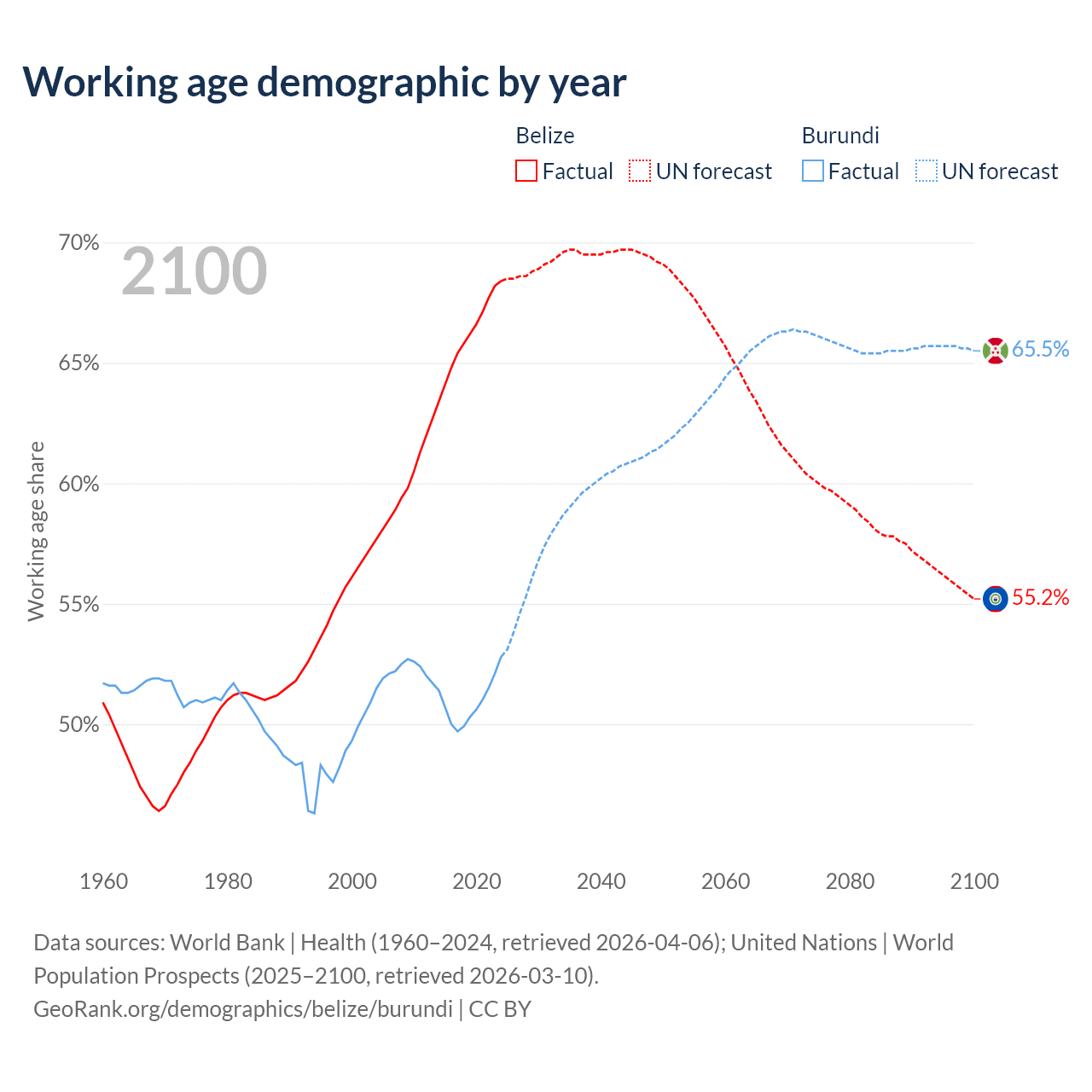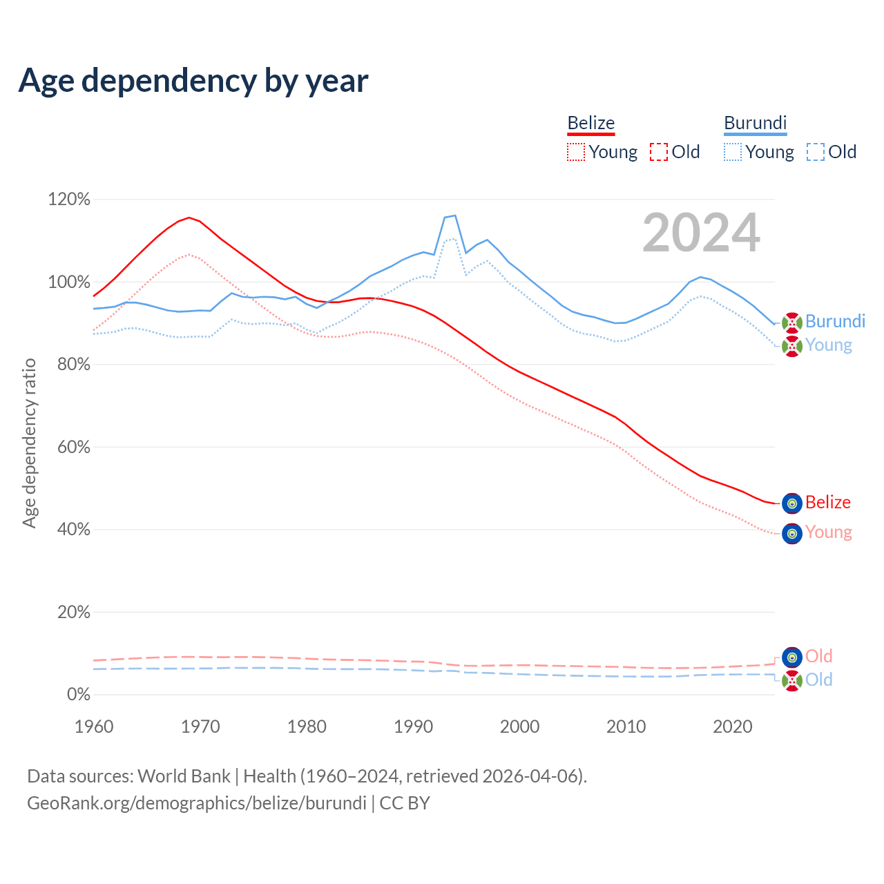 - The share of old-age demographic (65+) in Belize is 5.02% vs 2.53% in Burundi.