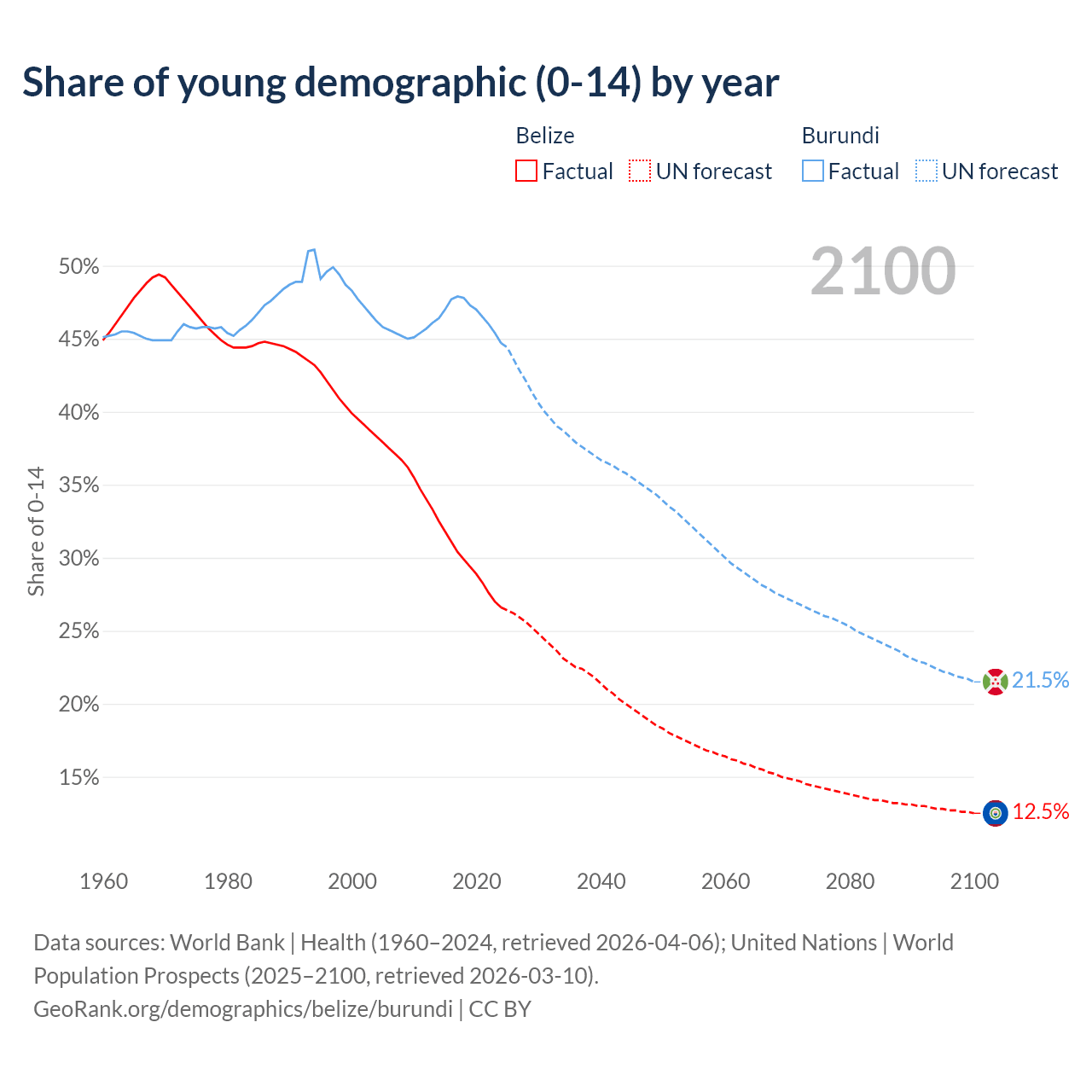 - The share of young demographic (0-15 years old) in Belize is 26.6% vs 44.7% in Burundi.