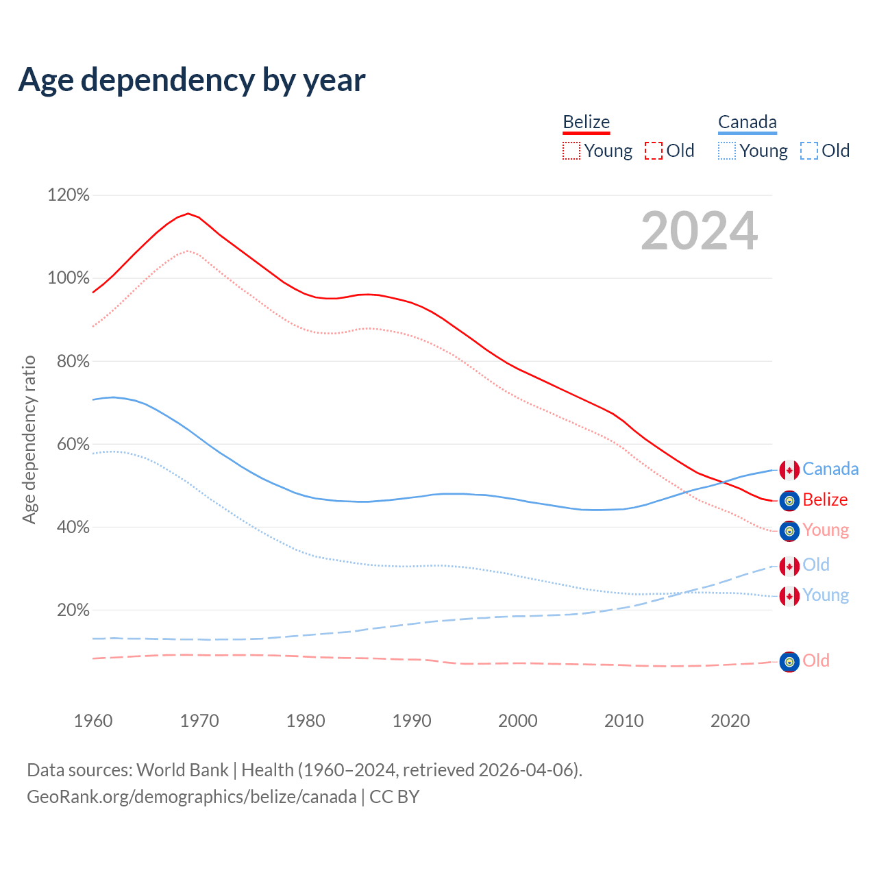 The share of older people aged 65 and over is 5.02% in Belize and 19.8% in Canada. Life expectancy in Belize compared to Canada .
