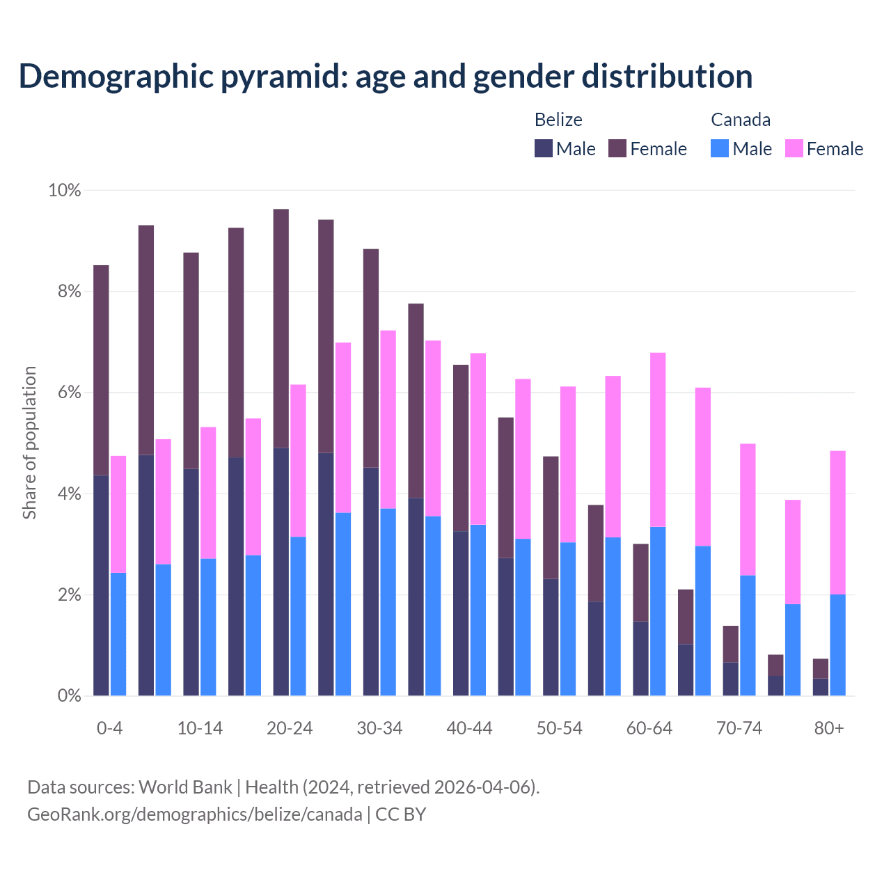 - The share of old-age demographic (65+) in Belize is 5.02% vs 19.8% in Canada.