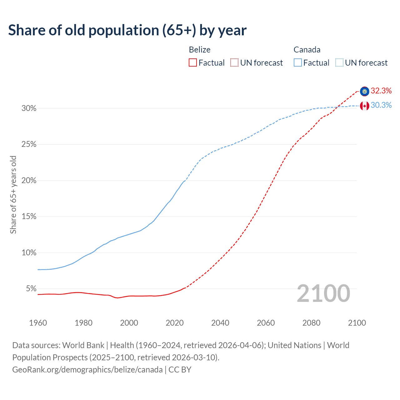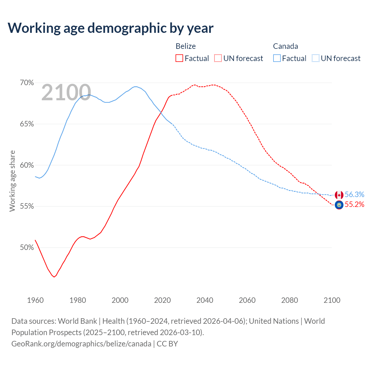 Median age Belize vs Canada, 1960-2100