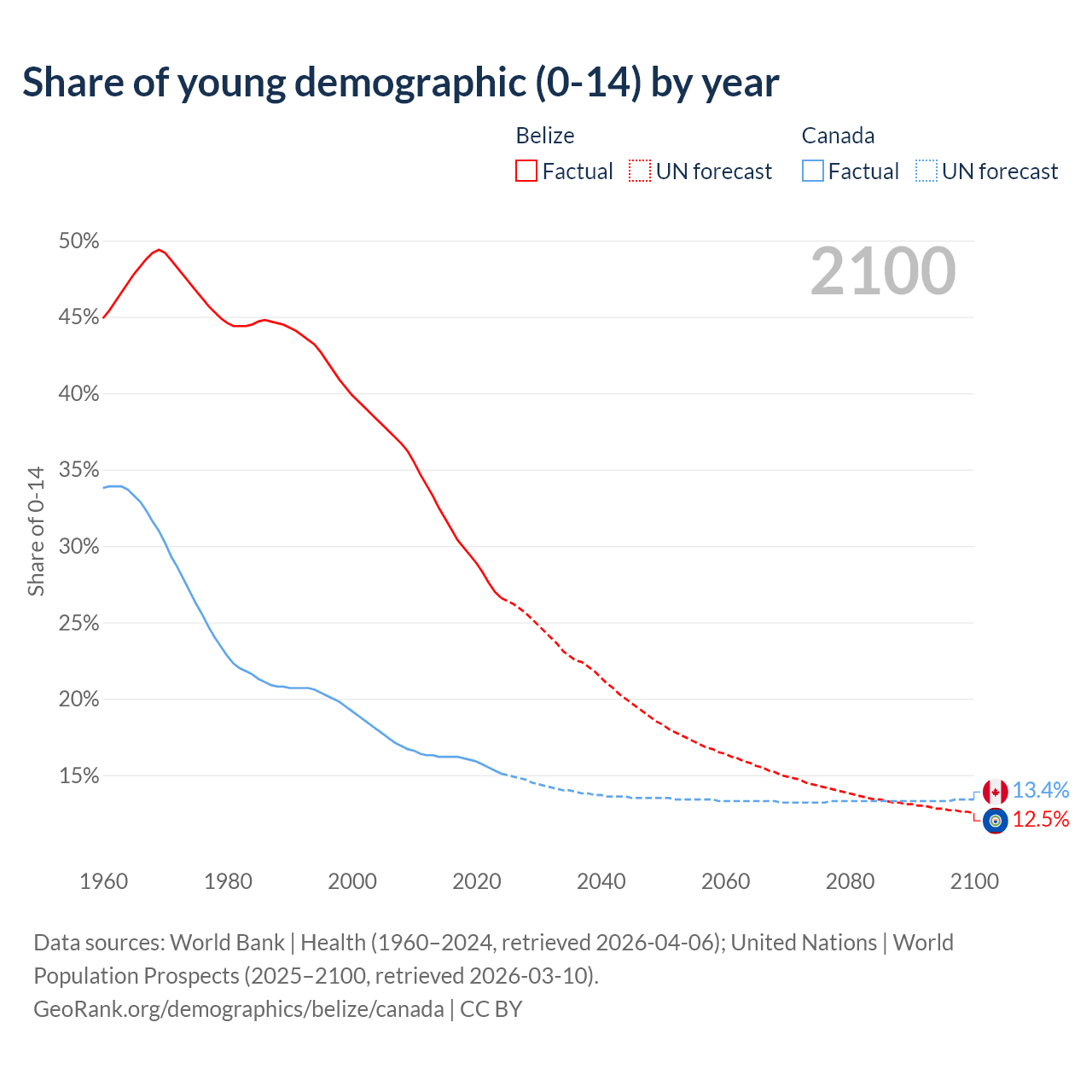 - The share of young demographic (0-15 years old) in Belize is 26.6% vs 15.1% in Canada.