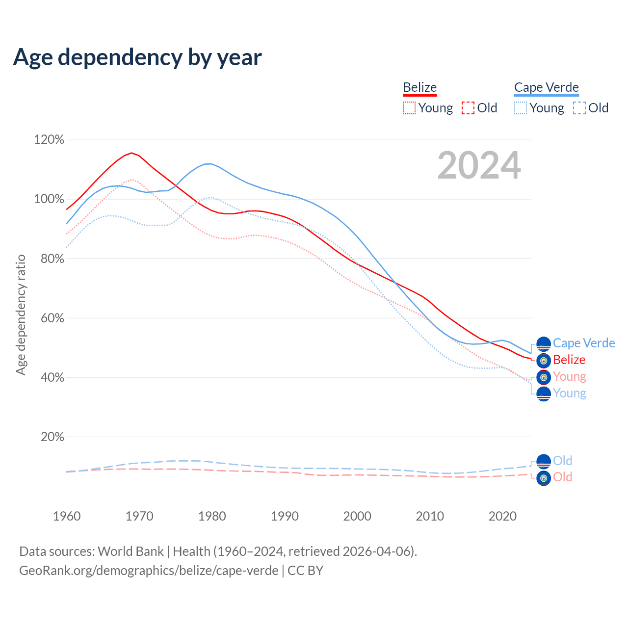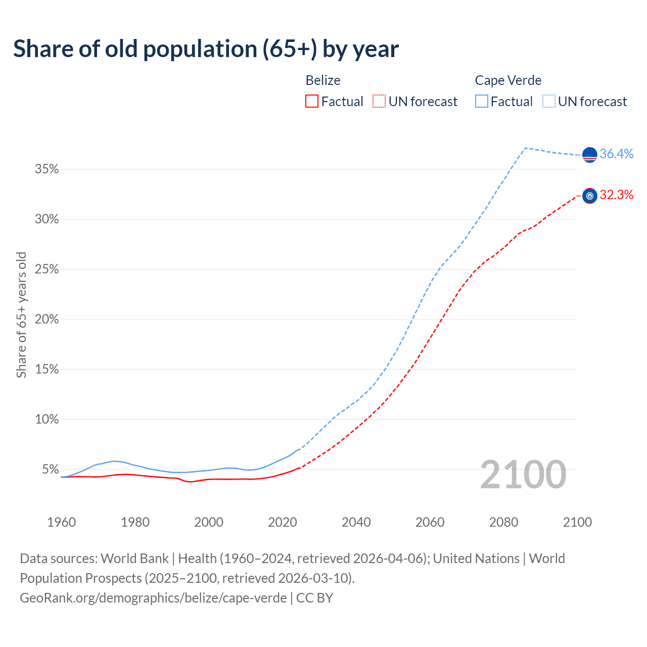 - The share of old-age demographic (65+) in Belize is 5.02% vs 6.86% in Cape Verde.