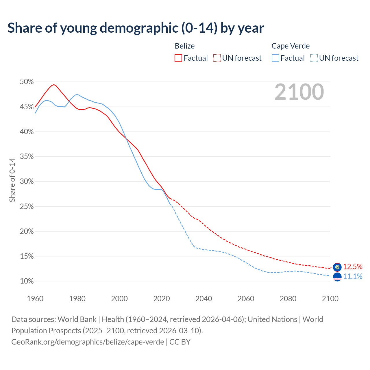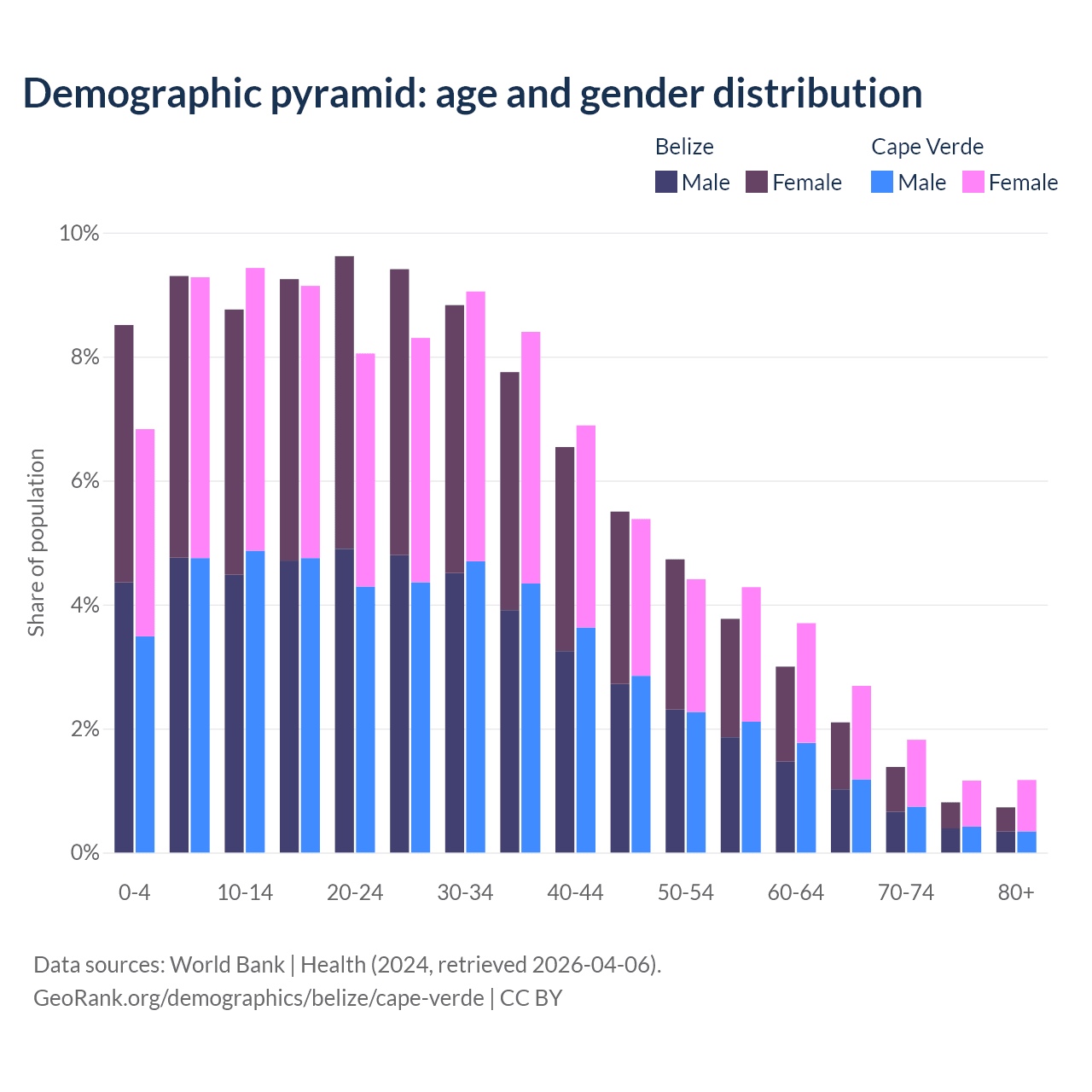 - The share of young demographic (0-15 years old) in Belize is 26.6% vs 25.5% in Cape Verde.