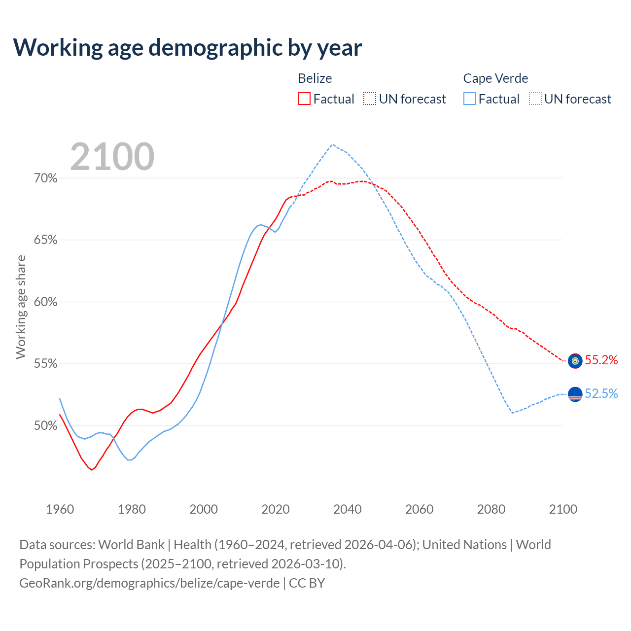 Median age Belize vs Cape Verde, 1960-2100
