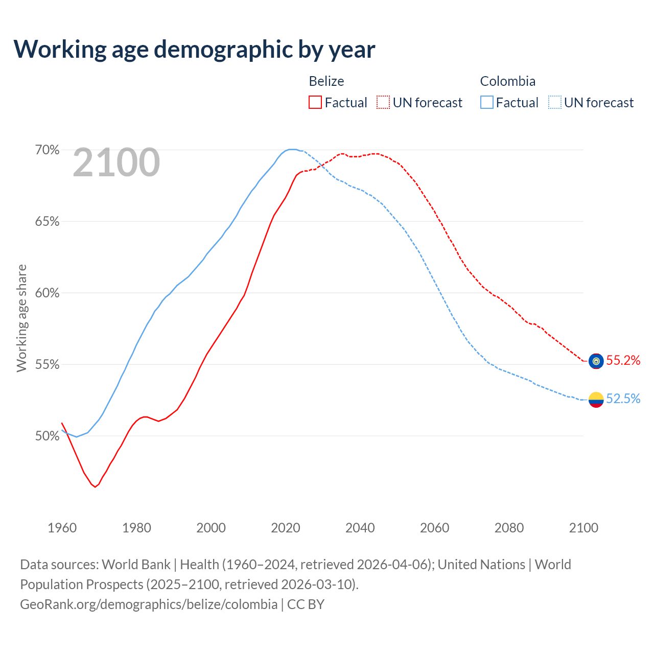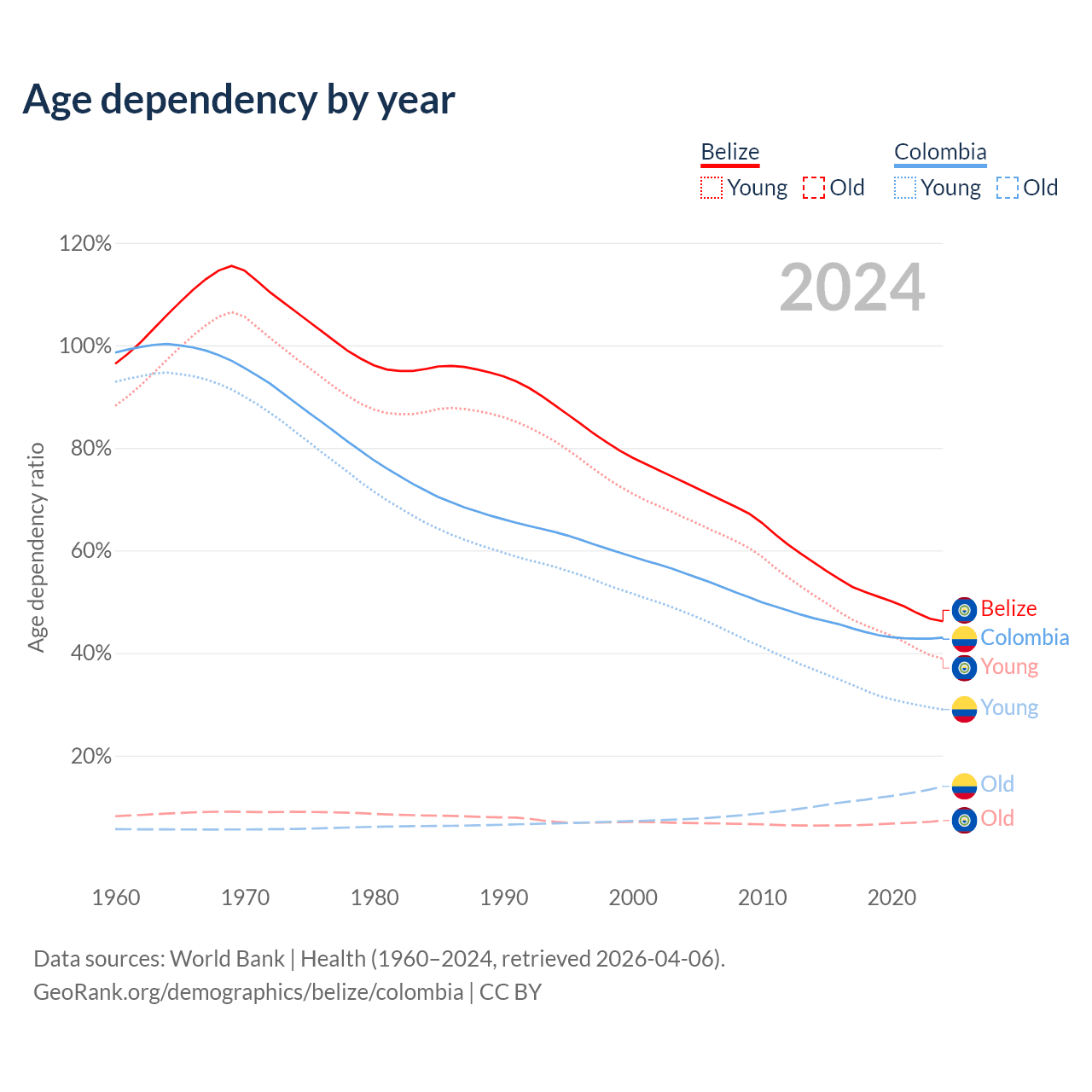 - The share of old-age demographic (65+) in Belize is 5.02% vs 9.78% in Colombia.
