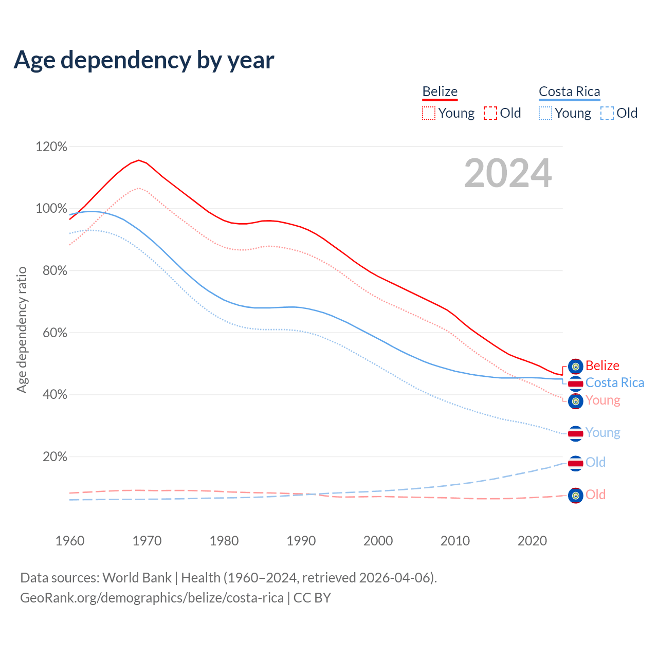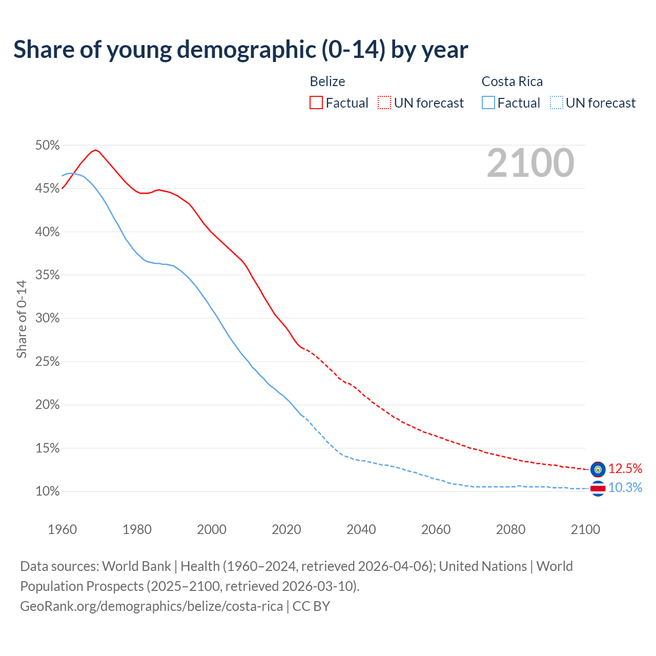 - The share of young demographic (0-15 years old) in Belize is 26.6% vs 18.8% in Costa Rica.