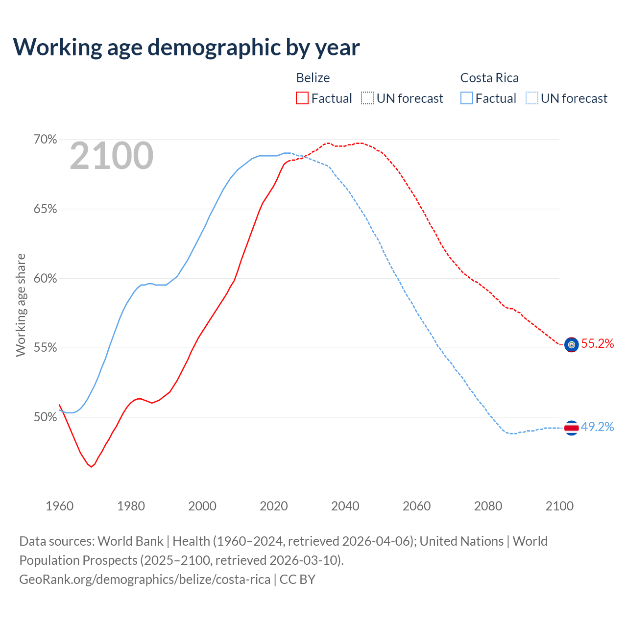 The share of older people aged 65 and over is 5.02% in Belize and 12.2% in Costa Rica. Life expectancy in Belize compared to Costa Rica .