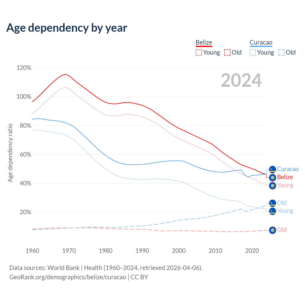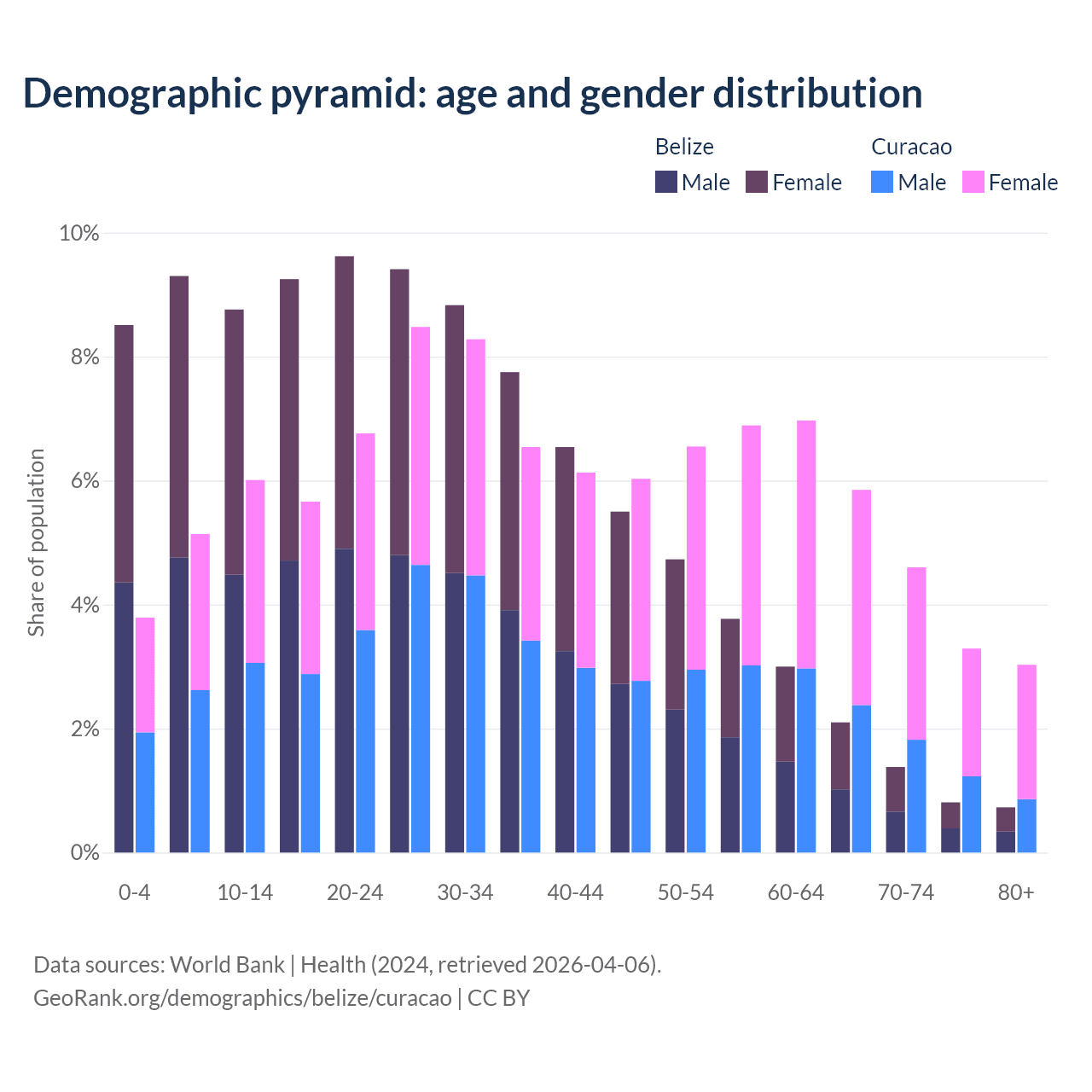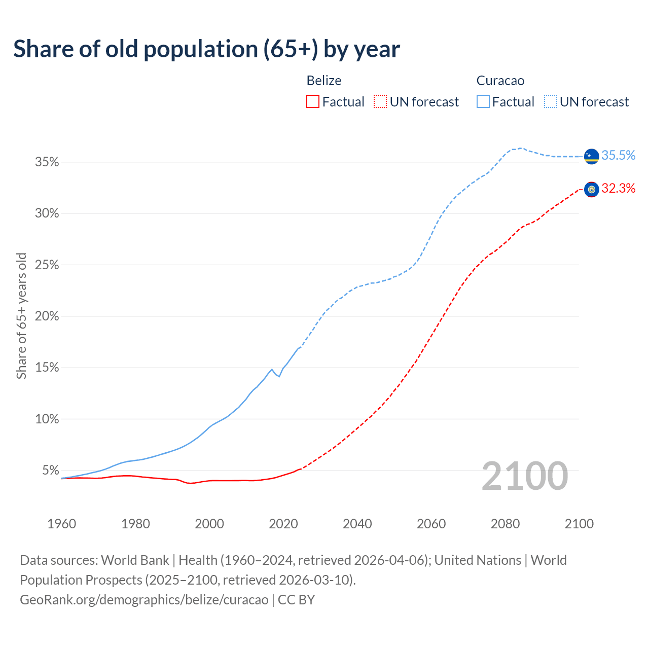 - The share of old-age demographic (65+) in Belize is 5.02% vs 16.8% in Curacao.