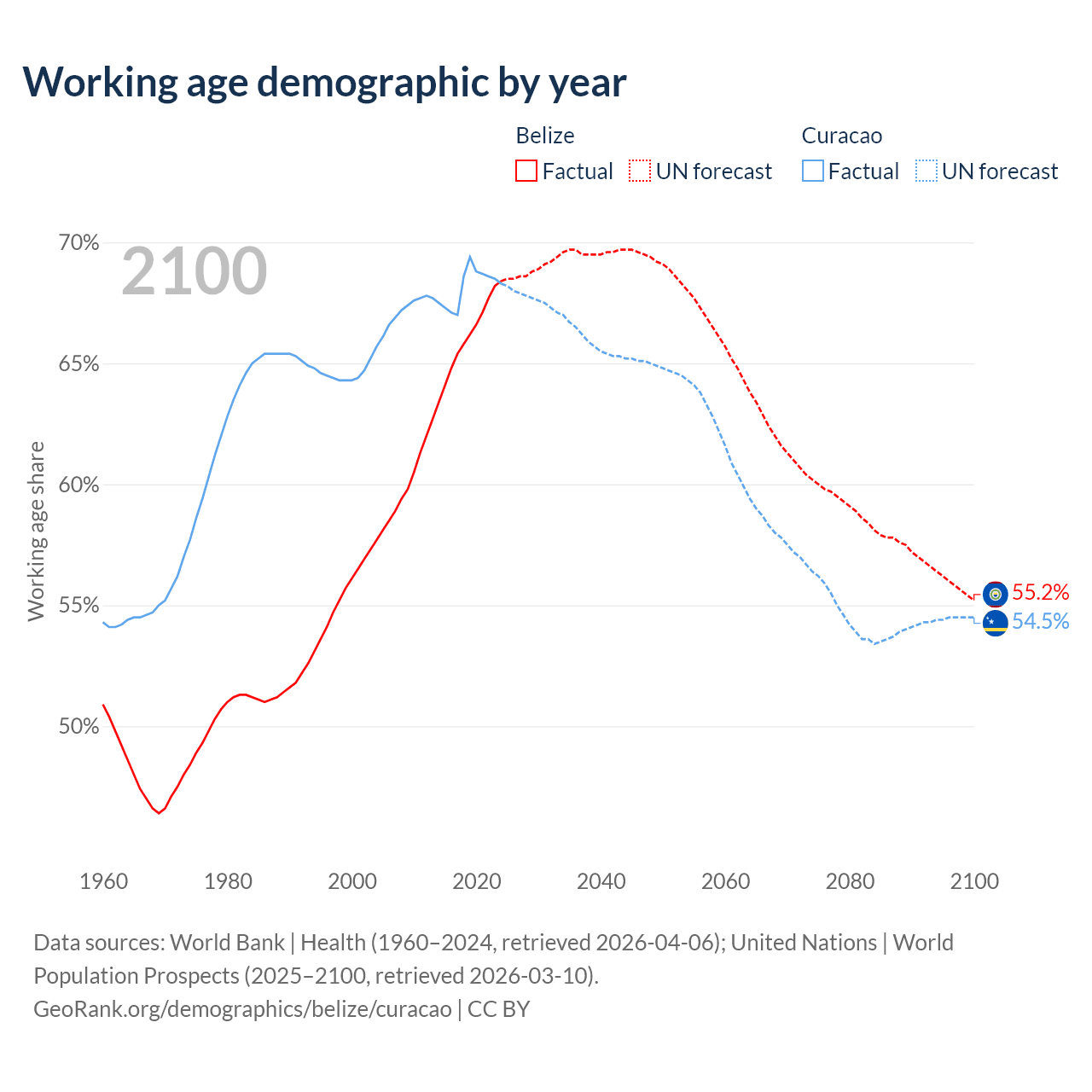 Median age Belize vs Curacao, 1960-2100
