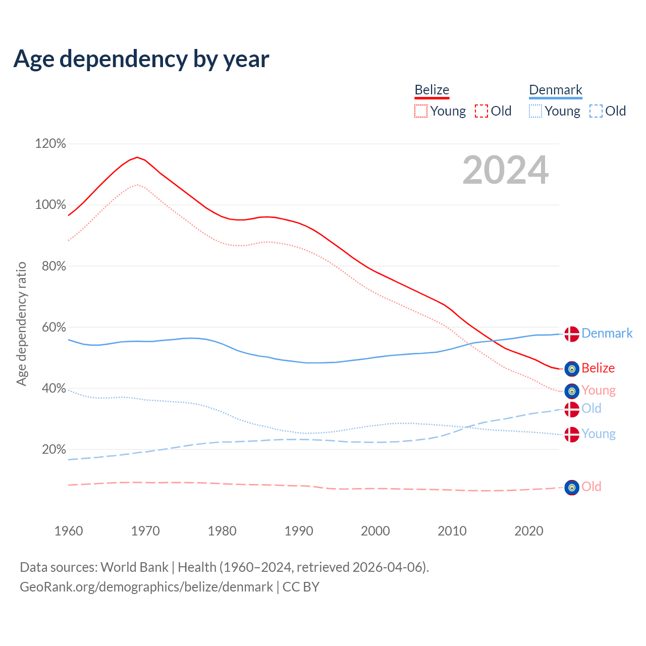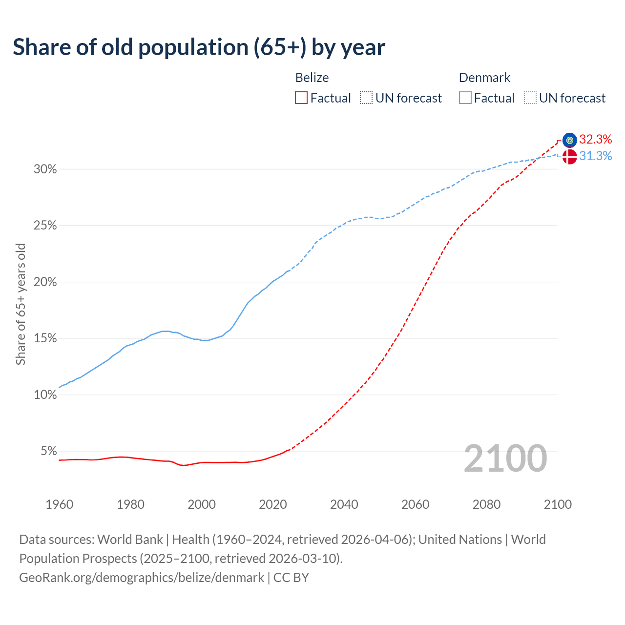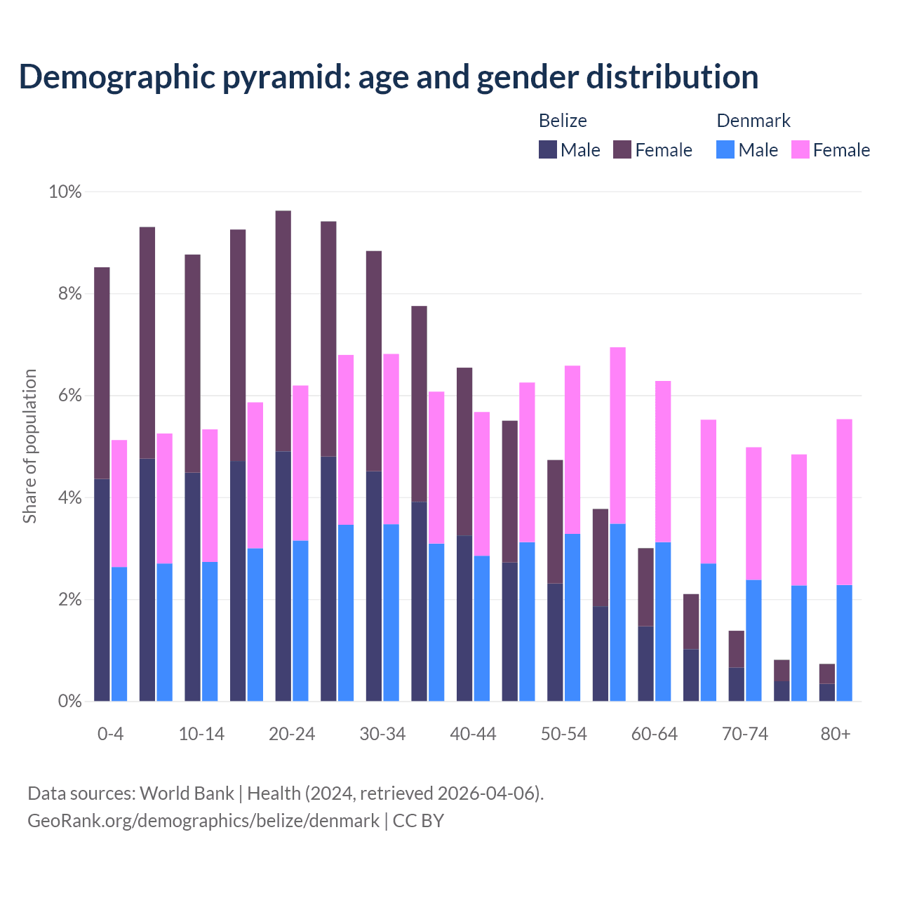 - The share of old-age demographic (65+) in Belize is 5.02% vs 20.9% in Denmark.