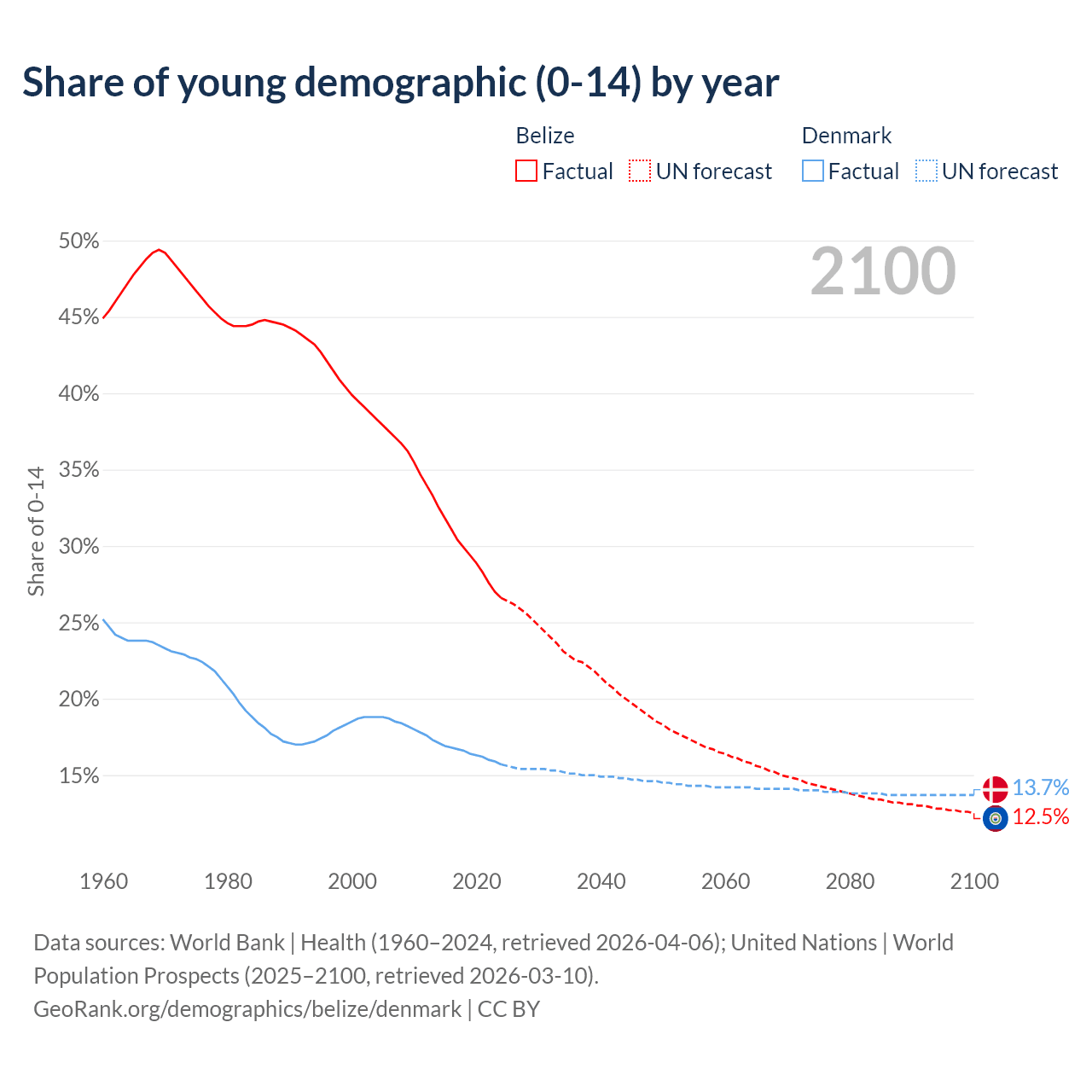 - The share of young demographic (0-15 years old) in Belize is 26.6% vs 15.7% in Denmark.