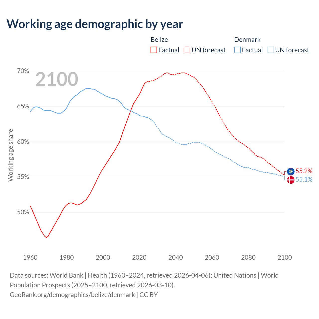 Median age Belize vs Denmark, 1960-2100