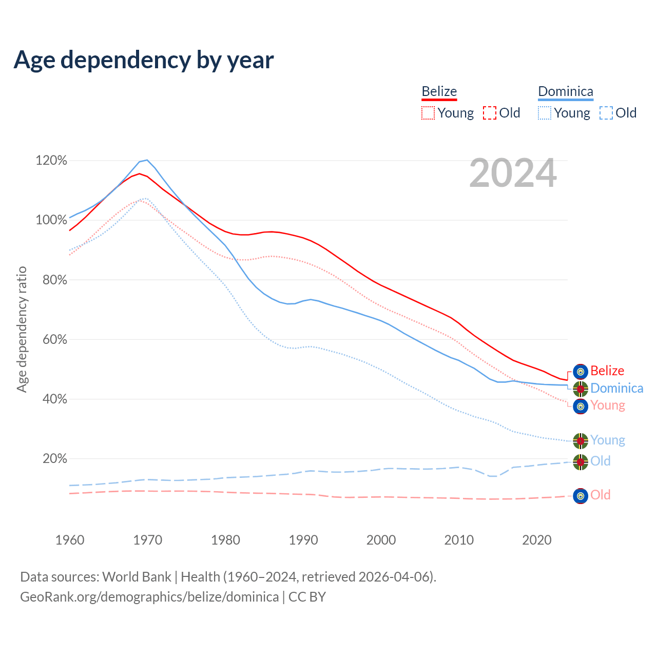 - The share of young demographic (0-15 years old) in Belize is 26.6% vs 17.9% in Dominica.