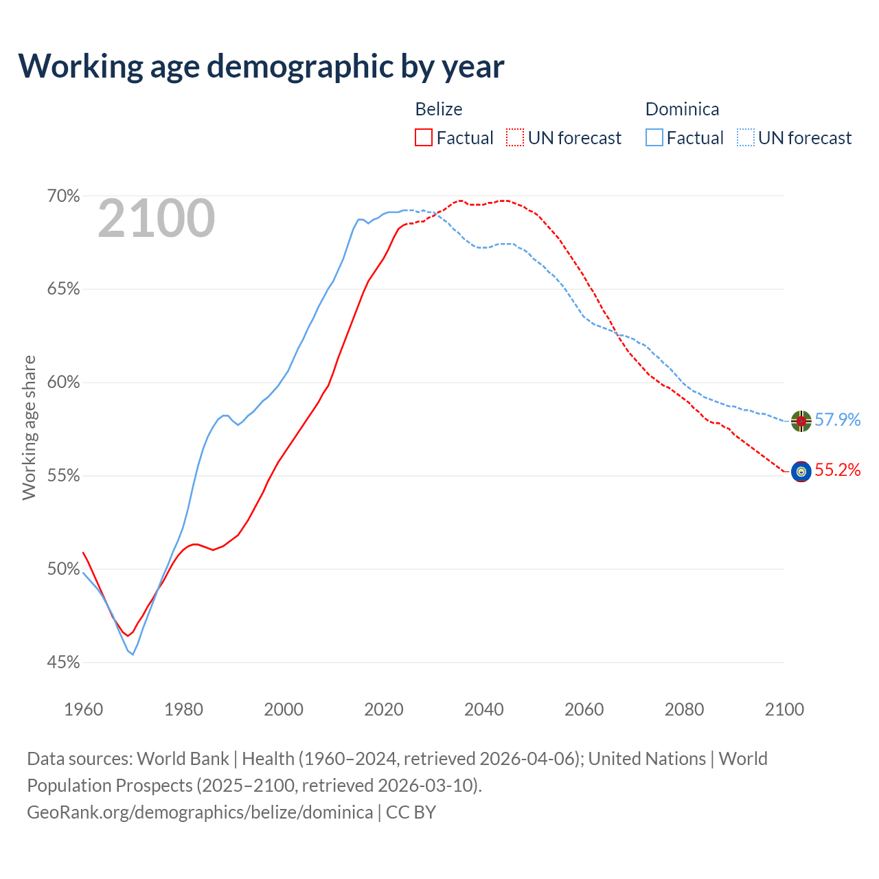 Median age Belize vs Dominica, 1960-2100